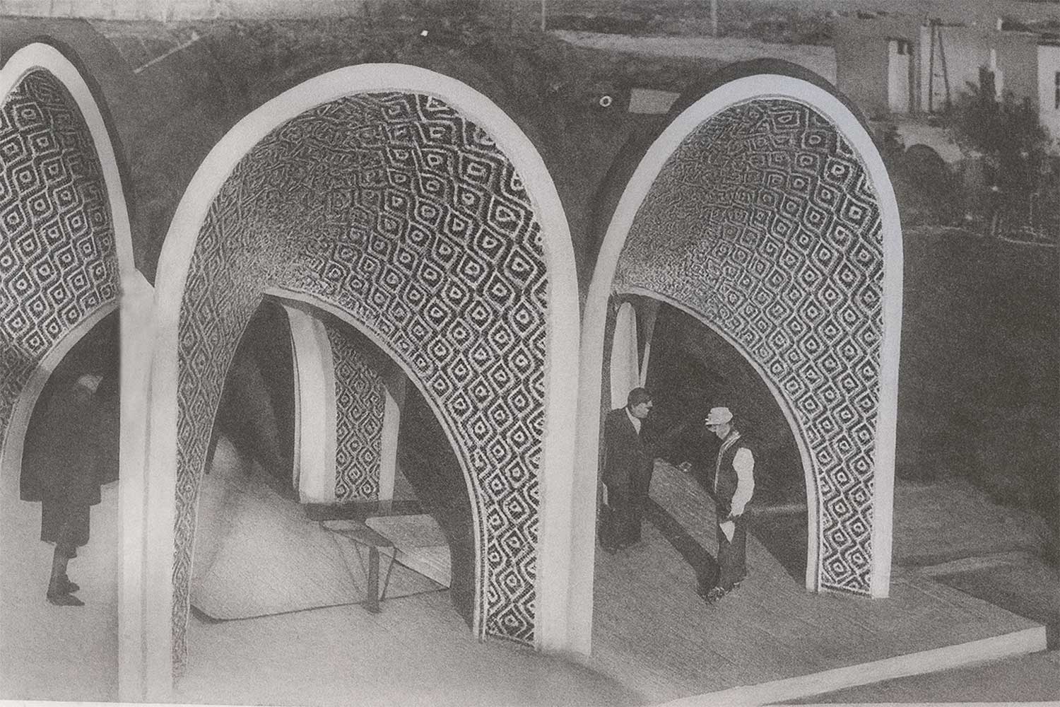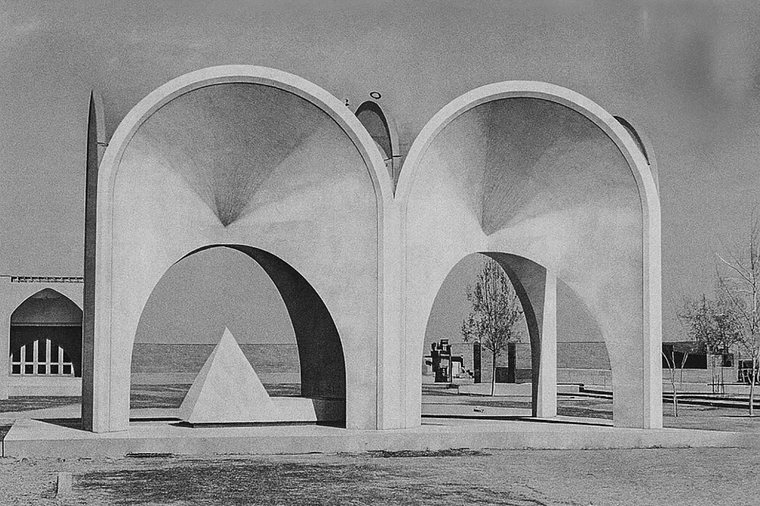 “From Khayyam’s garden, after traveling about two kilometers westward, one arrives at another garden—the resting place of Sheikh Farid al-Din Attar, marked by an ancient mausoleum. Nearby lies the burial site of the famous painter Kamal-ol-Molok, for which I was also commissioned to design a memorial. The plan of this monument consists of two adjoining squares forming a rectangle in the proportion of 1:2. For each square, one arch was designed on each side, resulting in six arches along the four sides of the rectangle. In addition, the diagonals of the squares generate four intersecting arches within, making a total of ten arches. Their intersections and vaulting above created conical geometric forms—a geometric invention. With mosaic tile decoration applied to these surfaces, the work recalls the architecture of Kashan, the birthplace of Kamal-ol-Molok. The gravestone itself, carved from a single block of Mashhad granite, is composed of a reclining and a raised portion. On the raised section, the relief portrait of Kamal-ol-Molok was sculpted by Abol-Hassan Seddighi. The building and its covering are executed in reinforced concrete.”