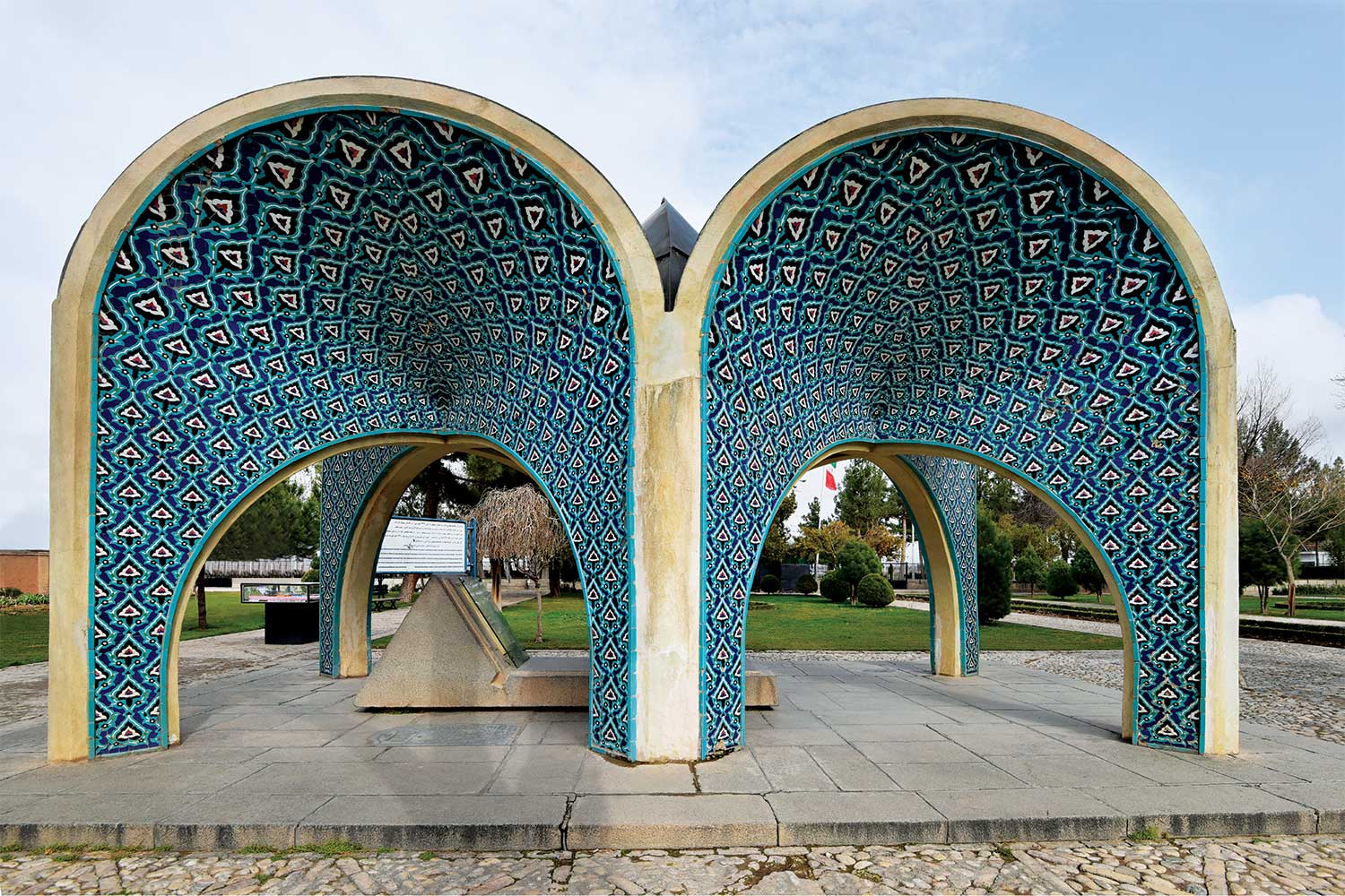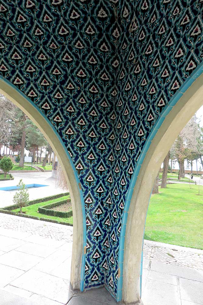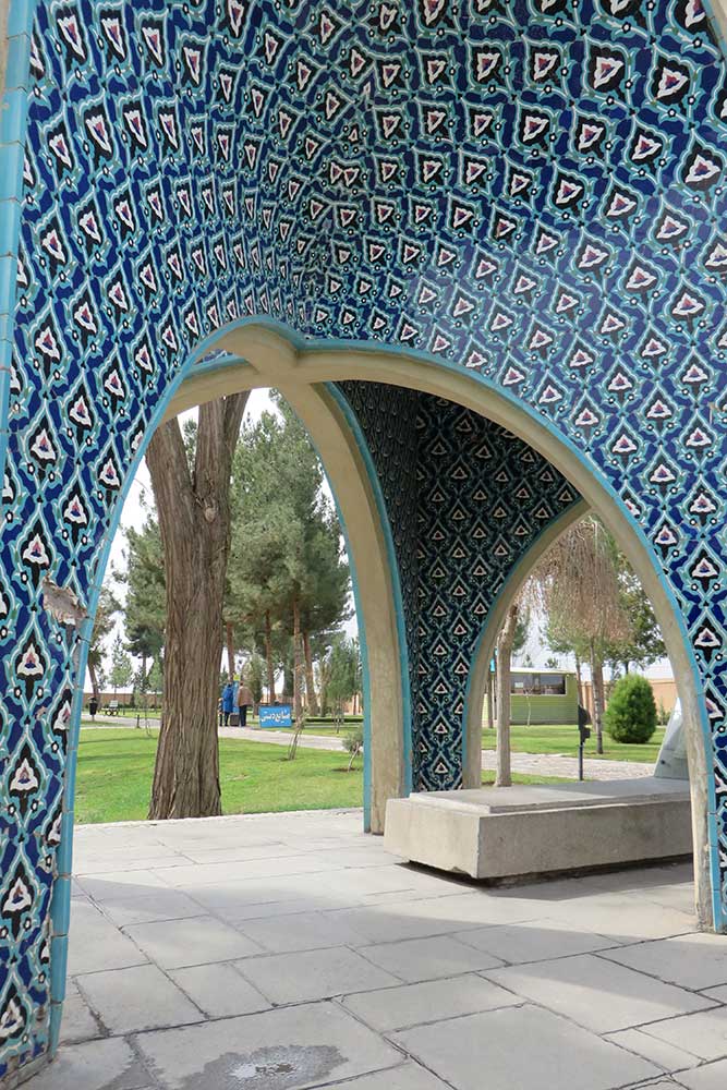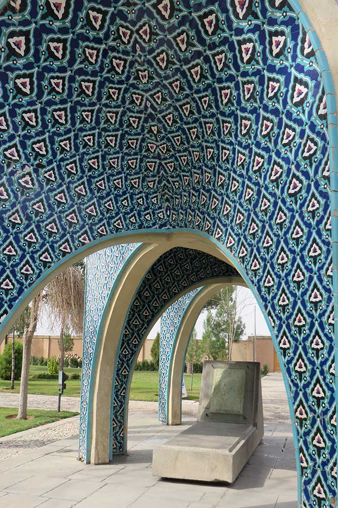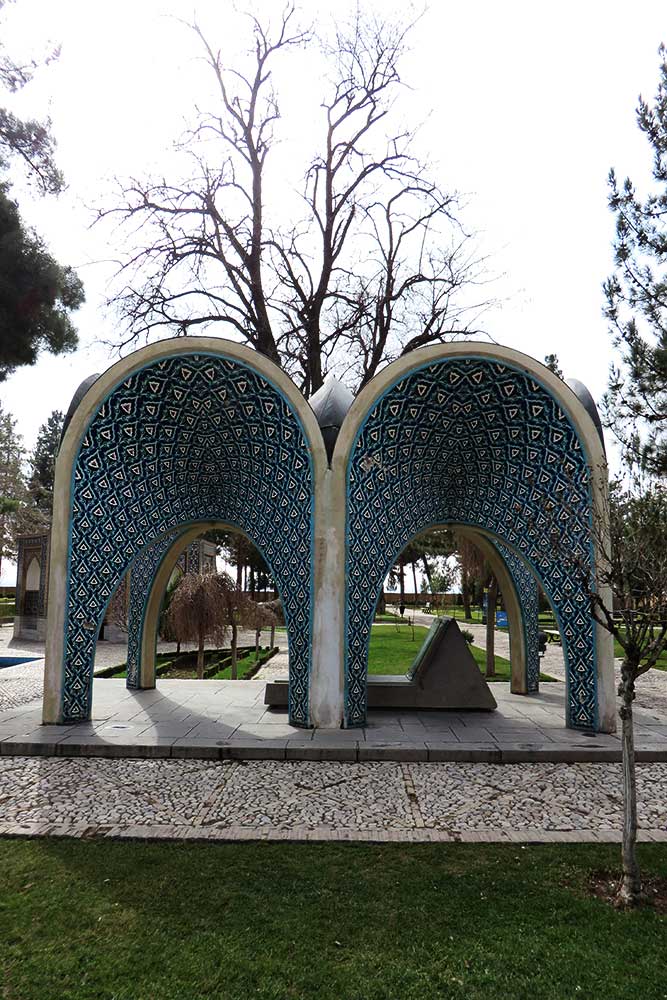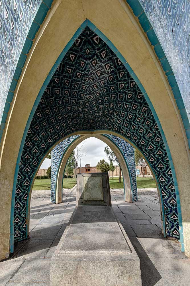 In 1957 (1336 SH), engineers Seyhoun and Hossein Joudat, on assignment from the Society, inspected the site and recommended that the tomb be covered with a concrete structure suited to its setting, leaving the surroundings open. In March 1959 (Esfand 1337 SH), Seyhoun was formally contracted to prepare the architectural plans within two months, which, after approval, would be delivered to the contractor. Seyhoun also accepted full responsibility for supervising the project on behalf of the Society. Thus, construction began in early 1959 (1338 SH) by the company K.J.T under Seyhoun’s supervision. By 1961 (1340 SH), the foundation, steel framework, tilework, gravestone, a stone relief bust of Kamal-ol-Molok (by Abol-Hassan Seddighi, one of his pupils), landscaping, pathways, and two pools were completed. A monument befitting his era and artistic world had finally been built. On Tuesday, March 3, 1964 (12 Esfand 1342 SH), the mausoleum was formally visited by Mohammad Reza Shah. The Mausoleum of Kamal-ol-Molok stands north of Sheikh Attar’s tomb. Built in reinforced concrete, it covers a 28-square-meter base and features six concave niches, their recesses adorned with exquisite mosaic tilework in cobalt, white, and other tones. With its skillful fusion of tradition and modernity, the monument evokes arches, vaults, and iwans of Iranian architecture in symbolic form. The plan is based on two square modules forming a rectangle with a 2:1 ratio—a proportion deeply rooted in Iranian tradition, visible in the palaces of Persepolis, both in detail and in entirety. The façades emphasize semi-circular arches; the main volume is created from intersecting arches inscribed on the diagonals of the square, recalling the chahar-bagh vaults familiar in Persian architecture, and likely serving as Seyhoun’s source of inspiration. By twisting this principle and employing it in a shell-concrete system, he achieved a novel geometry of striking complexity. Two distinct types of arches appear in the design: six semi-circular exterior arches with a span-to-height ratio of 1:1.2, and four intersecting interior arches aligned with the diagonals. In addition, smaller arches appear at the base, the natural result of these intersections. The overall volume may thus be seen as a three-dimensional shell seamlessly uniting both arch types. The tilework applied to the curved surfaces, executed with masterly precision, diminishes in size toward the axis of symmetry, enhancing the visual rhythm. These designs recall the traditional tilework of Kashan, Kamal-ol-Molok’s birthplace. The vault ornamentation, inspired by Kashan’s traditional ceramic artistry, produces conical geometric forms at the crown—an inventive spatial resolution that exemplifies Seyhoun’s genius in reinterpreting Persian architectural elements into a modern idiom. As with the Tomb of Khayyam, geometry plays a defining role here, forging a profound bond between the monument and Iran’s architectural heritage. The decorative motifs, adapted from the plasterwork of the Borujerdi House and from Kashan’s timchehs and bazaars, further anchor the design in tradition. The harmony of form, ornament, and glazed color establishes a striking affinity with the adjacent Mausoleum of Attar, to the extent that at first glance visitors may perceive them as two parts of a single composition.