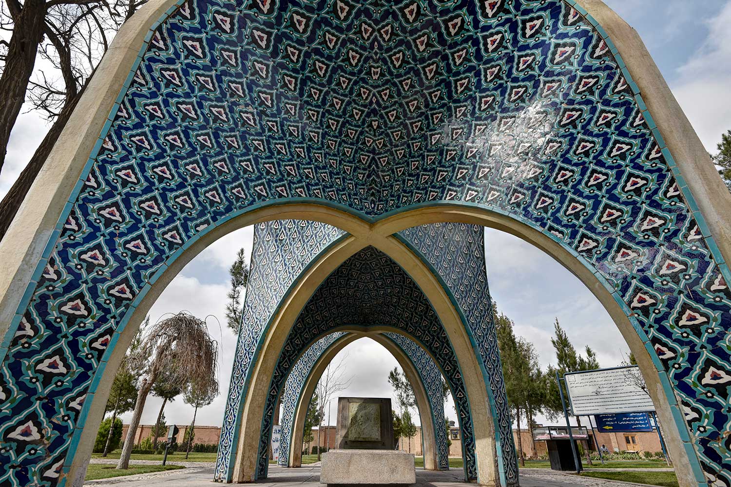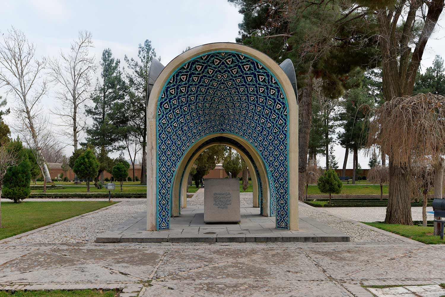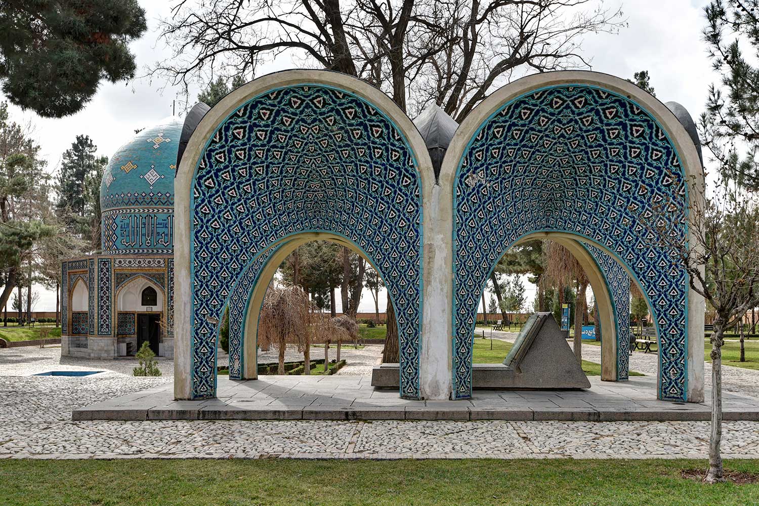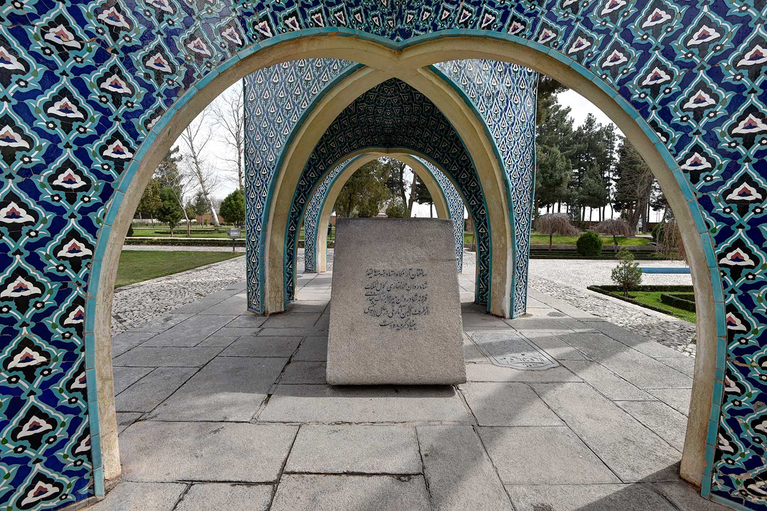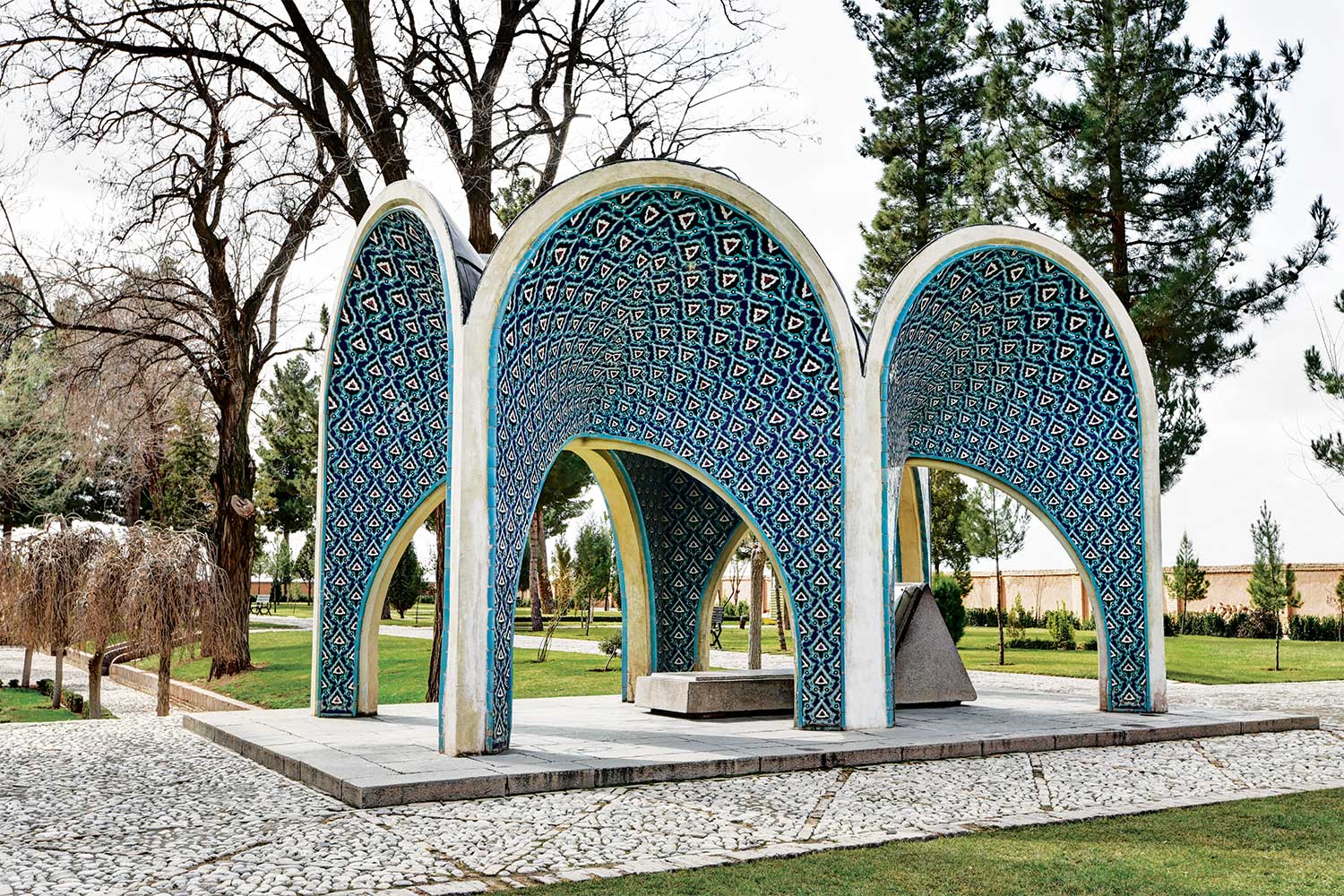 In 1957 (1336 SH), engineers Seyhoun and Hossein Joudat, on assignment from the Society, inspected the site and recommended that the tomb be covered with a concrete structure suited to its setting, leaving the surroundings open. In March 1959 (Esfand 1337 SH), Seyhoun was formally contracted to prepare the architectural plans within two months, which, after approval, would be delivered to the contractor. Seyhoun also accepted full responsibility for supervising the project on behalf of the Society. Thus, construction began in early 1959 (1338 SH) by the company K.J.T under Seyhoun’s supervision. By 1961 (1340 SH), the foundation, steel framework, tilework, gravestone, a stone relief bust of Kamal-ol-Molok (by Abol-Hassan Seddighi, one of his pupils), landscaping, pathways, and two pools were completed. A monument befitting his era and artistic world had finally been built. On Tuesday, March 3, 1964 (12 Esfand 1342 SH), the mausoleum was formally visited by Mohammad Reza Shah. The Mausoleum of Kamal-ol-Molok stands north of Sheikh Attar’s tomb. Built in reinforced concrete, it covers a 28-square-meter base and features six concave niches, their recesses adorned with exquisite mosaic tilework in cobalt, white, and other tones. With its skillful fusion of tradition and modernity, the monument evokes arches, vaults, and iwans of Iranian architecture in symbolic form. The plan is based on two square modules forming a rectangle with a 2:1 ratio—a proportion deeply rooted in Iranian tradition, visible in the palaces of Persepolis, both in detail and in entirety. The façades emphasize semi-circular arches; the main volume is created from intersecting arches inscribed on the diagonals of the square, recalling the chahar-bagh vaults familiar in Persian architecture, and likely serving as Seyhoun’s source of inspiration. By twisting this principle and employing it in a shell-concrete system, he achieved a novel geometry of striking complexity. Two distinct types of arches appear in the design: six semi-circular exterior arches with a span-to-height ratio of 1:1.2, and four intersecting interior arches aligned with the diagonals. In addition, smaller arches appear at the base, the natural result of these intersections. The overall volume may thus be seen as a three-dimensional shell seamlessly uniting both arch types. The tilework applied to the curved surfaces, executed with masterly precision, diminishes in size toward the axis of symmetry, enhancing the visual rhythm. These designs recall the traditional tilework of Kashan, Kamal-ol-Molok’s birthplace. The vault ornamentation, inspired by Kashan’s traditional ceramic artistry, produces conical geometric forms at the crown—an inventive spatial resolution that exemplifies Seyhoun’s genius in reinterpreting Persian architectural elements into a modern idiom. As with the Tomb of Khayyam, geometry plays a defining role here, forging a profound bond between the monument and Iran’s architectural heritage. The decorative motifs, adapted from the plasterwork of the Borujerdi House and from Kashan’s timchehs and bazaars, further anchor the design in tradition. The harmony of form, ornament, and glazed color establishes a striking affinity with the adjacent Mausoleum of Attar, to the extent that at first glance visitors may perceive them as two parts of a single composition.
