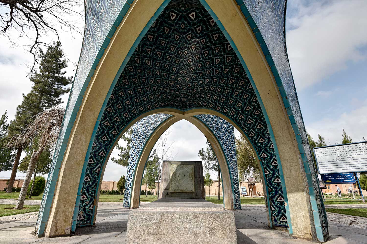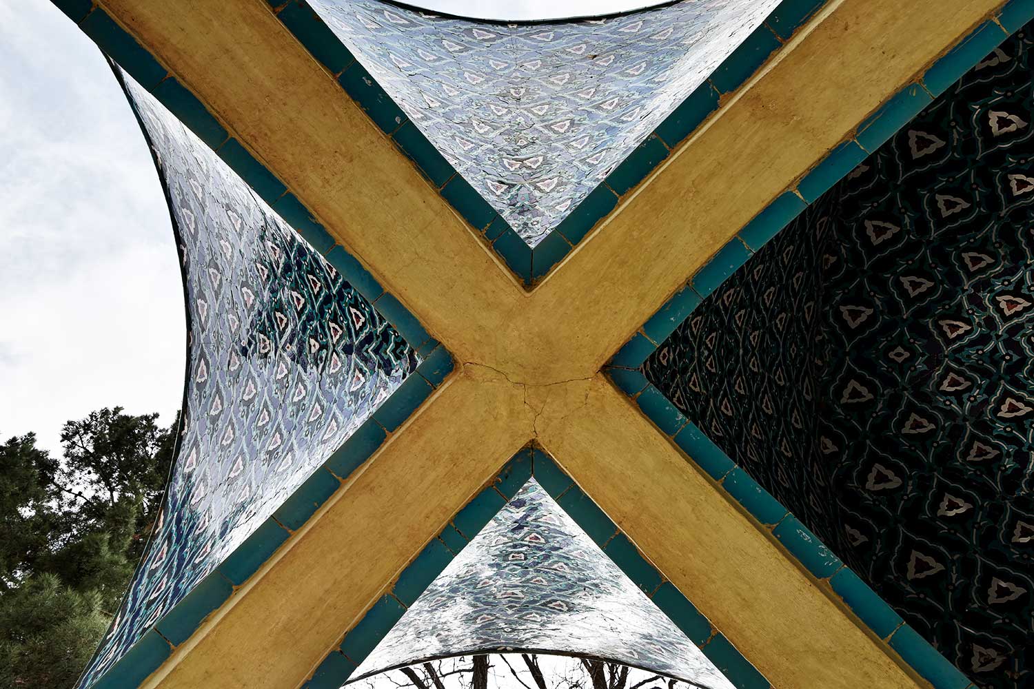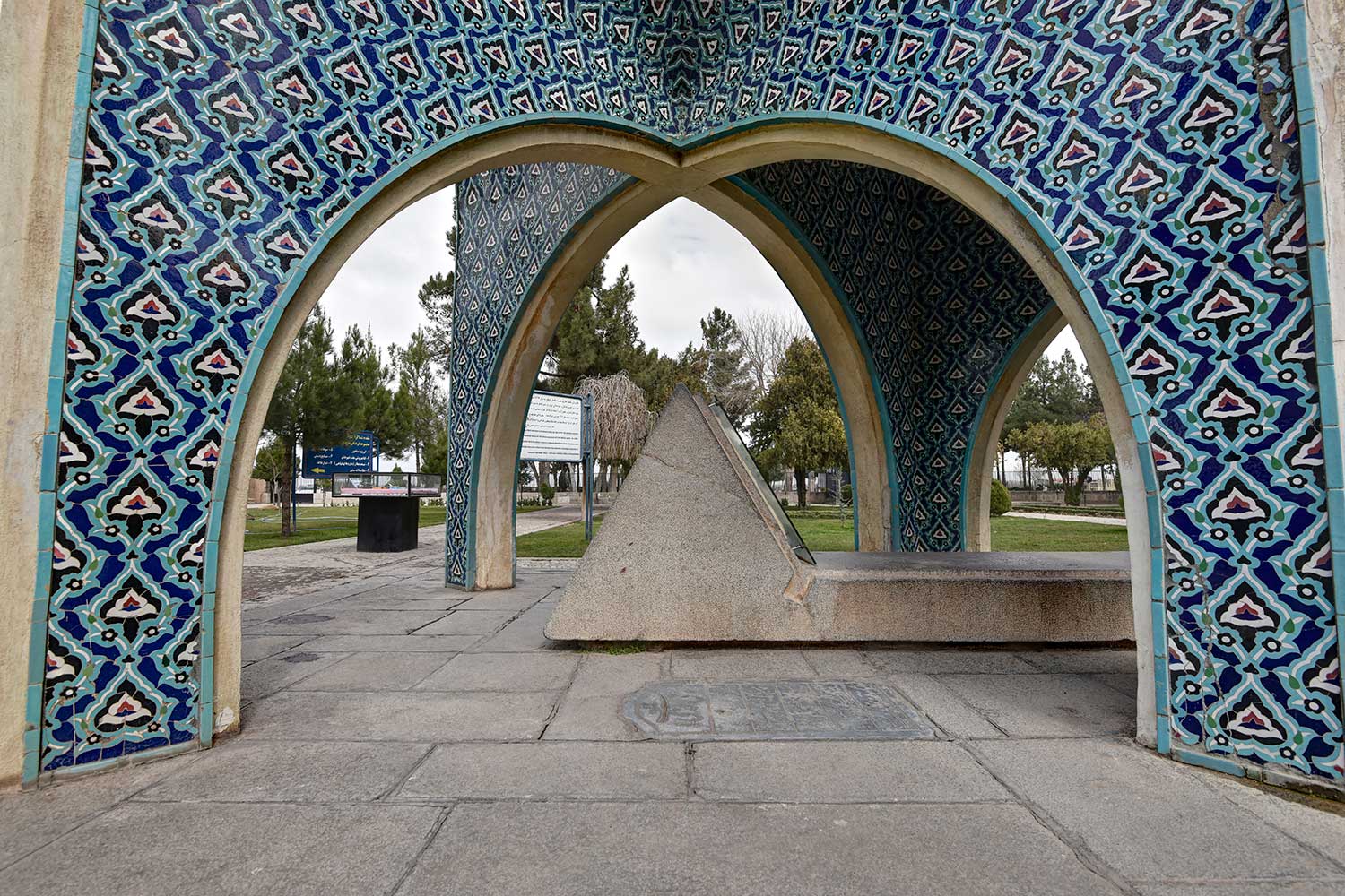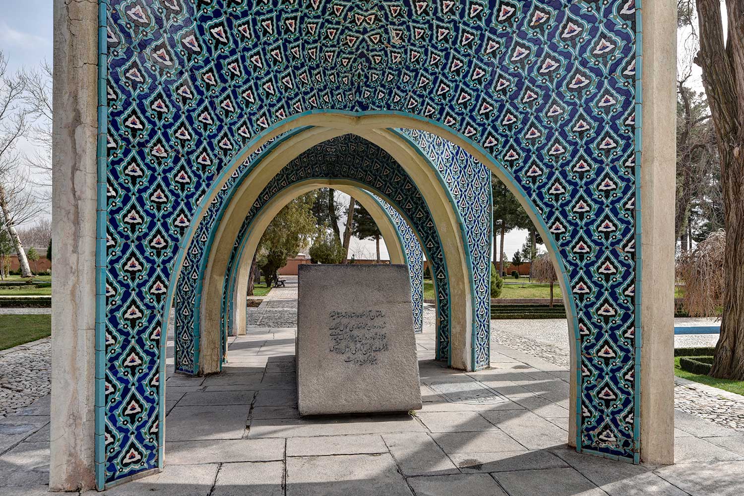 In 1957 (1336 SH), engineers Seyhoun and Hossein Joudat, on assignment from the Society, inspected the site and recommended that the tomb be covered with a concrete structure suited to its setting, leaving the surroundings open. In March 1959 (Esfand 1337 SH), Seyhoun was formally contracted to prepare the architectural plans within two months, which, after approval, would be delivered to the contractor. Seyhoun also accepted full responsibility for supervising the project on behalf of the Society. Thus, construction began in early 1959 (1338 SH) by the company K.J.T under Seyhoun’s supervision. By 1961 (1340 SH), the foundation, steel framework, tilework, gravestone, a stone relief bust of Kamal-ol-Molok (by Abol-Hassan Seddighi, one of his pupils), landscaping, pathways, and two pools were completed. A monument befitting his era and artistic world had finally been built. On Tuesday, March 3, 1964 (12 Esfand 1342 SH), the mausoleum was formally visited by Mohammad Reza Shah. The Mausoleum of Kamal-ol-Molok stands north of Sheikh Attar’s tomb. Built in reinforced concrete, it covers a 28-square-meter base and features six concave niches, their recesses adorned with exquisite mosaic tilework in cobalt, white, and other tones. With its skillful fusion of tradition and modernity, the monument evokes arches, vaults, and iwans of Iranian architecture in symbolic form. The plan is based on two square modules forming a rectangle with a 2:1 ratio—a proportion deeply rooted in Iranian tradition, visible in the palaces of Persepolis, both in detail and in entirety. The façades emphasize semi-circular arches; the main volume is created from intersecting arches inscribed on the diagonals of the square, recalling the chahar-bagh vaults familiar in Persian architecture, and likely serving as Seyhoun’s source of inspiration. By twisting this principle and employing it in a shell-concrete system, he achieved a novel geometry of striking complexity. Two distinct types of arches appear in the design: six semi-circular exterior arches with a span-to-height ratio of 1:1.2, and four intersecting interior arches aligned with the diagonals. In addition, smaller arches appear at the base, the natural result of these intersections. The overall volume may thus be seen as a three-dimensional shell seamlessly uniting both arch types. The tilework applied to the curved surfaces, executed with masterly precision, diminishes in size toward the axis of symmetry, enhancing the visual rhythm. These designs recall the traditional tilework of Kashan, Kamal-ol-Molok’s birthplace. The vault ornamentation, inspired by Kashan’s traditional ceramic artistry, produces conical geometric forms at the crown—an inventive spatial resolution that exemplifies Seyhoun’s genius in reinterpreting Persian architectural elements into a modern idiom. As with the Tomb of Khayyam, geometry plays a defining role here, forging a profound bond between the monument and Iran’s architectural heritage. The decorative motifs, adapted from the plasterwork of the Borujerdi House and from Kashan’s timchehs and bazaars, further anchor the design in tradition. The harmony of form, ornament, and glazed color establishes a striking affinity with the adjacent Mausoleum of Attar, to the extent that at first glance visitors may perceive them as two parts of a single composition.