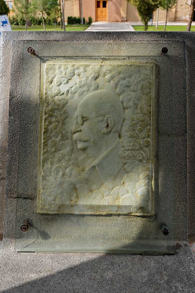 At the top of the prismatic section, a white stone slab bears a relief profile of Kamal-ol-Molok, sculpted by Abol-Hassan Seddighi, one of his pupils.