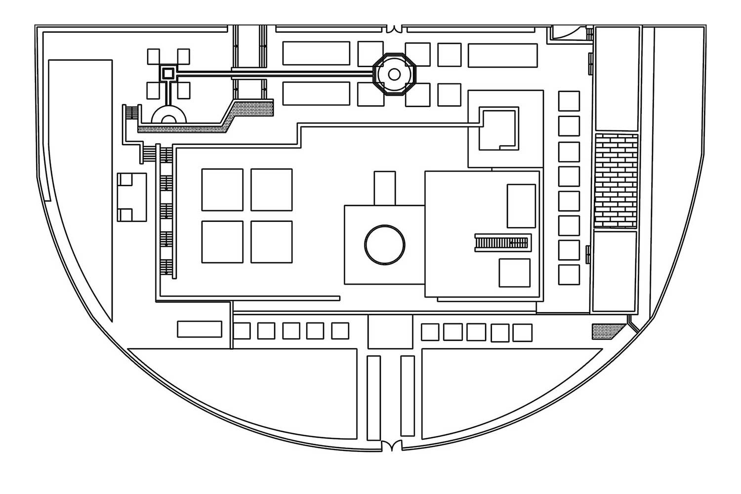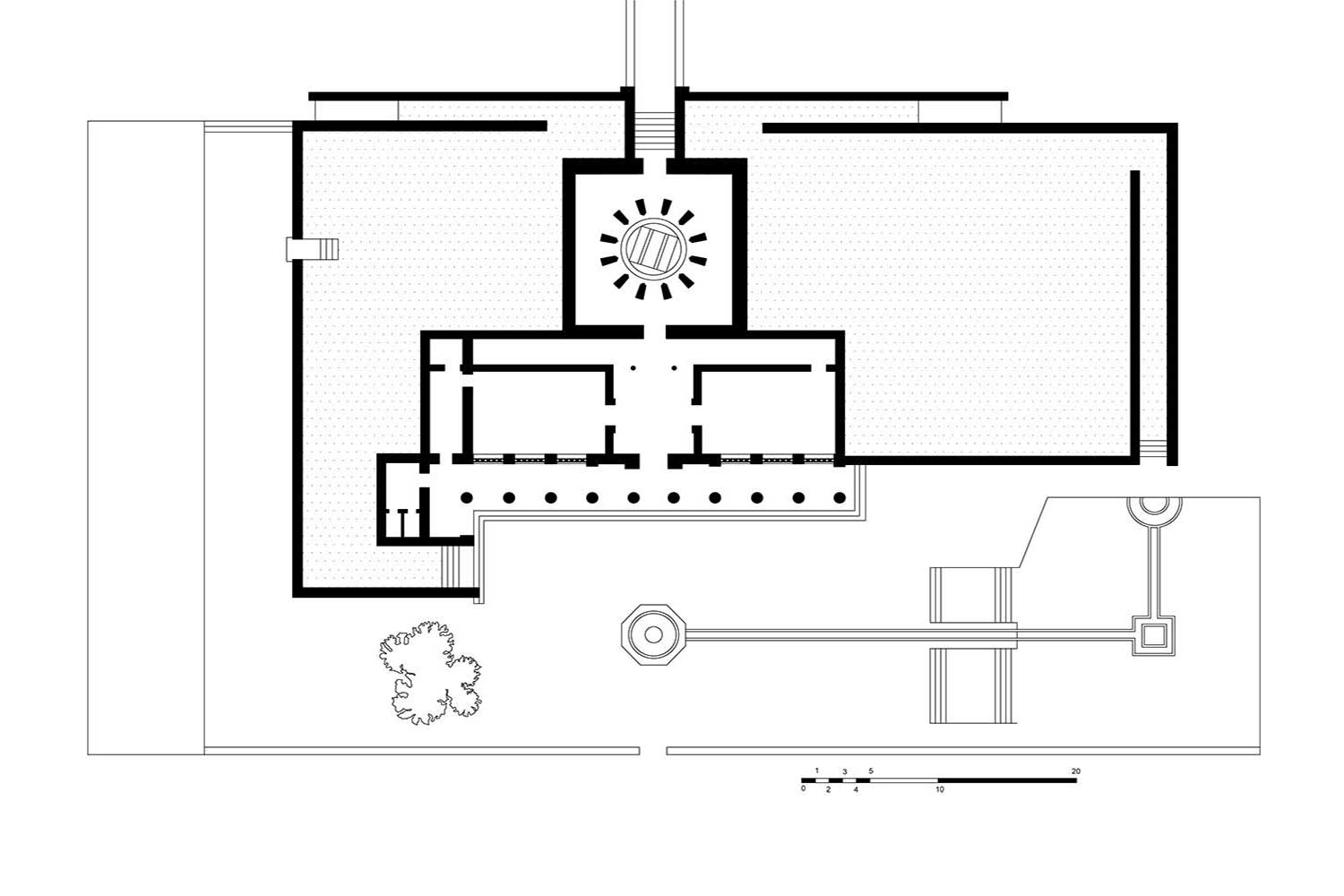 1. رواق ورودی اصلی 2. ورودی فرعی 3. پلکان شمالی و جنوب شرقی 4. پلکان جنوبی 5. شیبراهه های غربی 6. سرسرا 7. موزه 8. کتابخانه 9. آرامگاه 10. ساختمان خدماتی