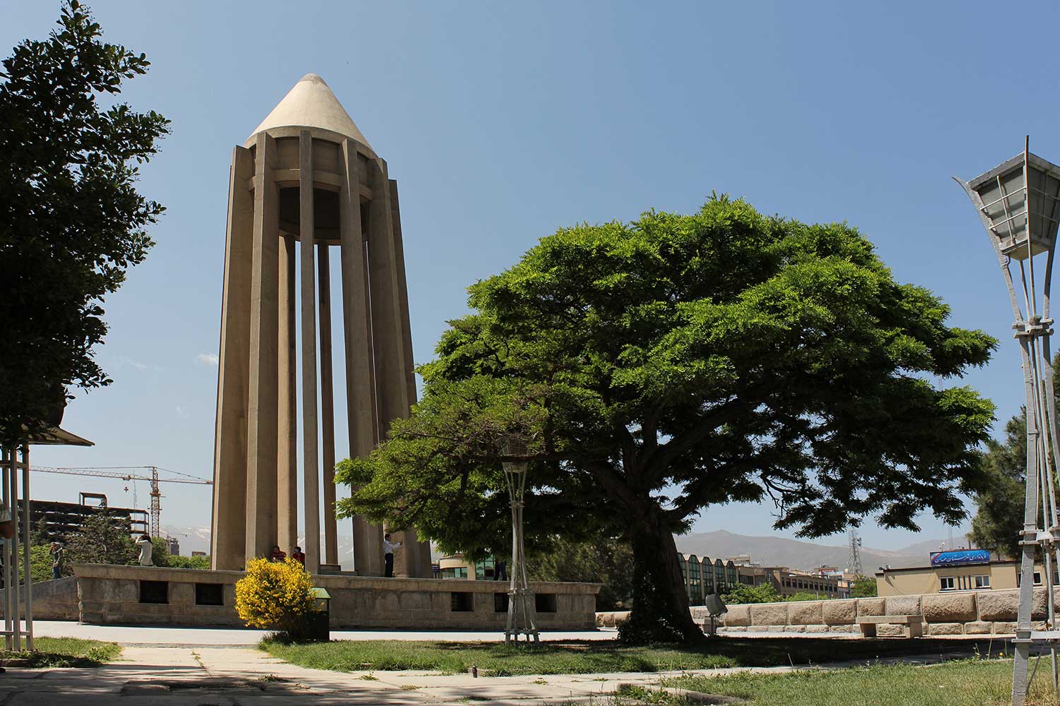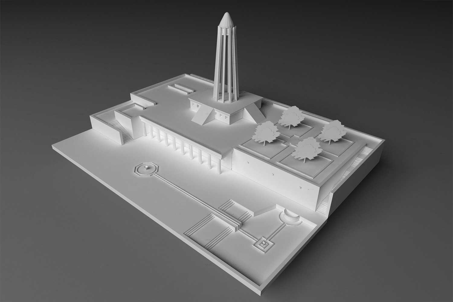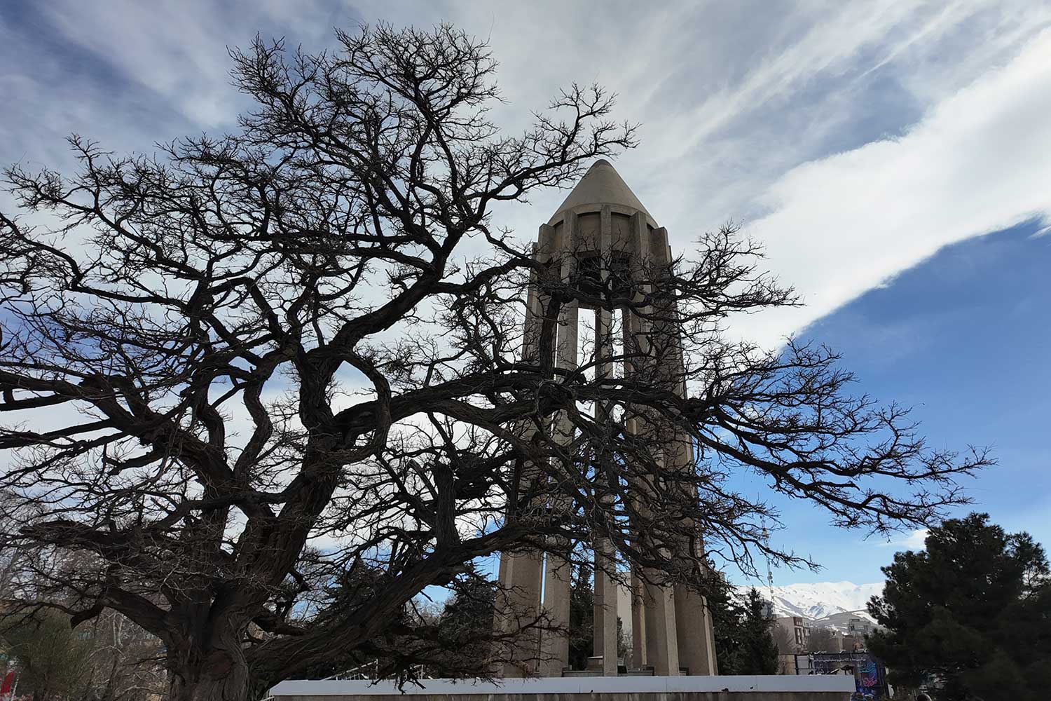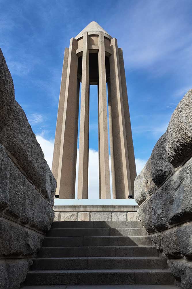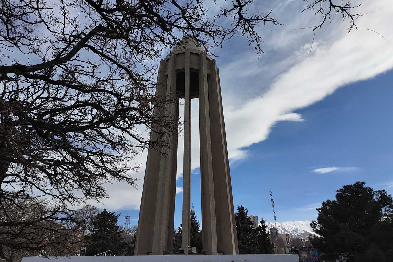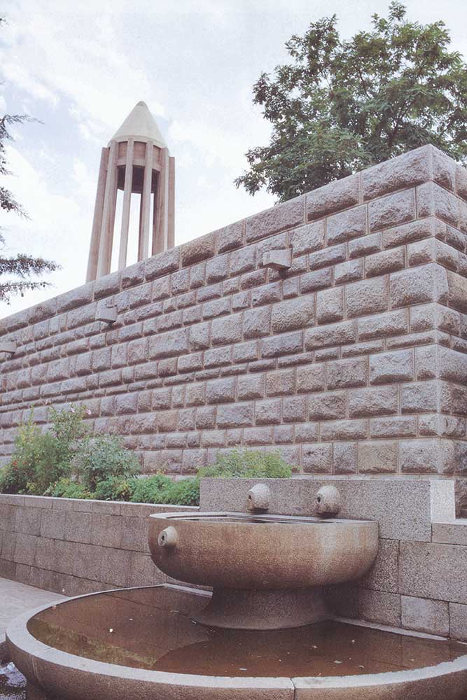 “The lower section evokes the grandeur of ancient Egyptian, Persian, and Greek architecture, while the twelve-ribbed tower recalls Gonbad-e Qabus. In construction and proportion, however, it is wholly modern. The rough-cut granite base symbolizes strength; the refined tower above conveys lightness and dignity. The surrounding gardens and fountains echo the freshness of the East and the harmony of the Hanging Gardens of Babylon.”