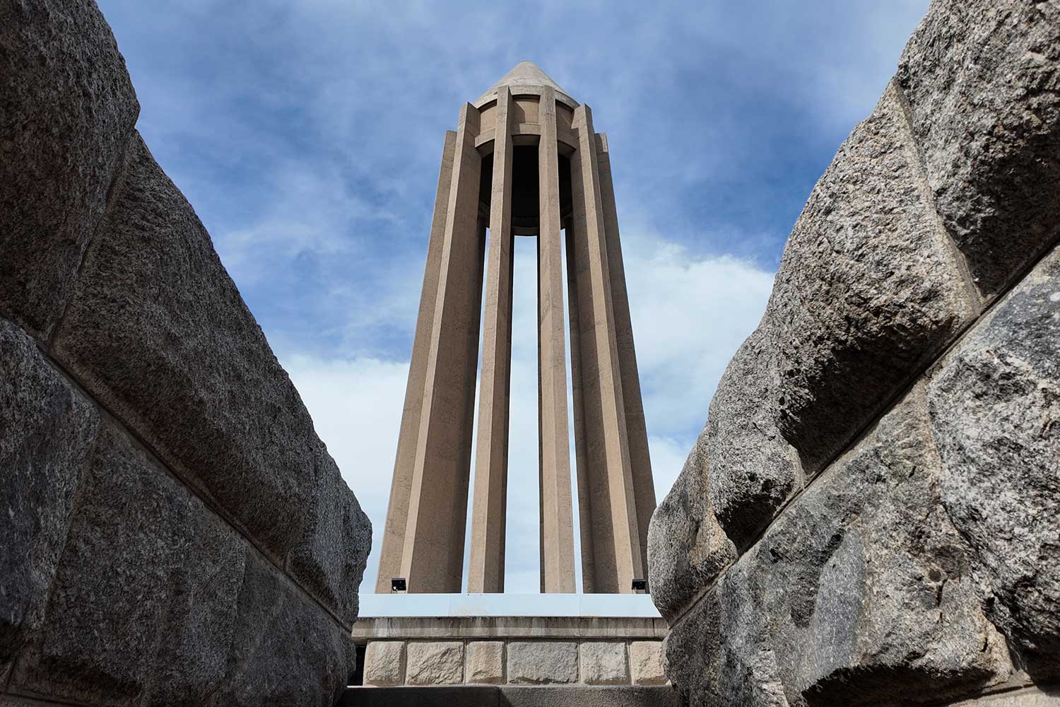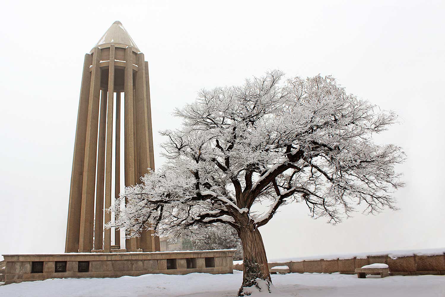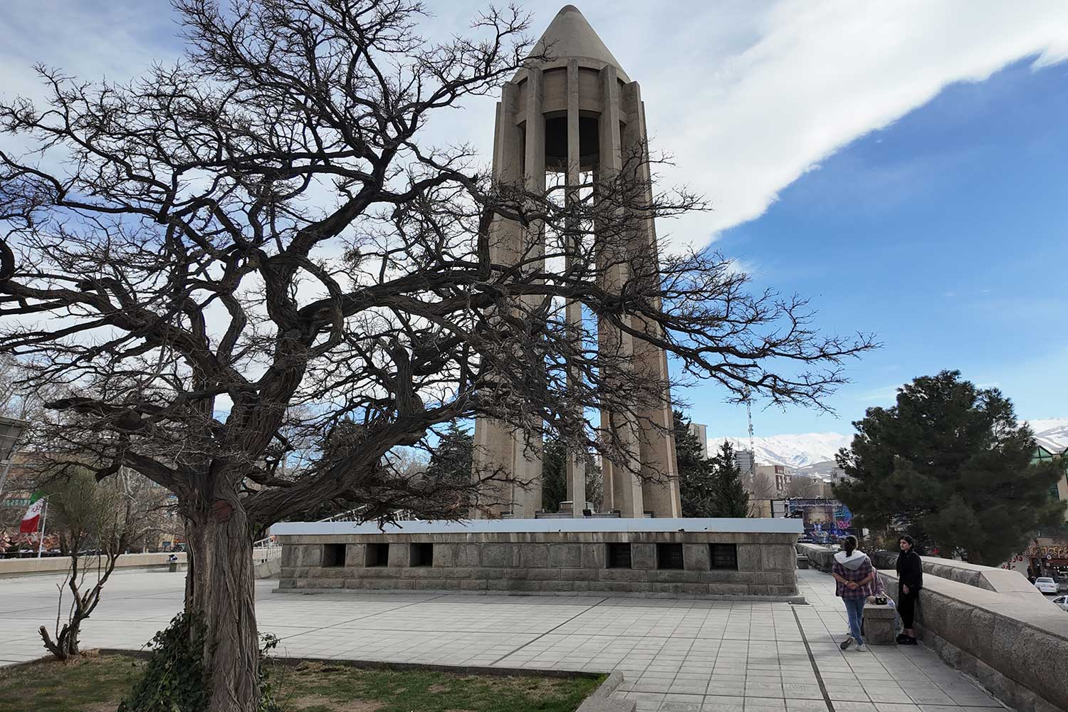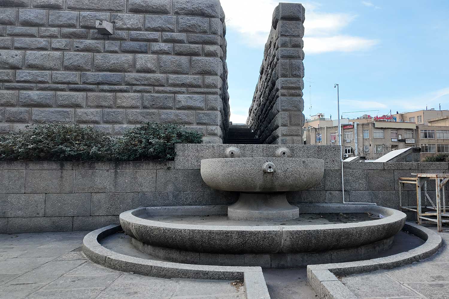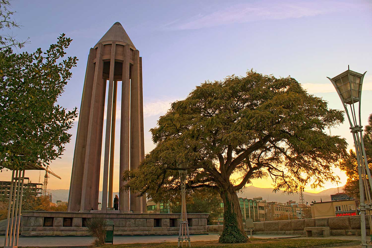 “The lower section evokes the grandeur of ancient Egyptian, Persian, and Greek architecture, while the twelve-ribbed tower recalls Gonbad-e Qabus. In construction and proportion, however, it is wholly modern. The rough-cut granite base symbolizes strength; the refined tower above conveys lightness and dignity. The surrounding gardens and fountains echo the freshness of the East and the harmony of the Hanging Gardens of Babylon.”