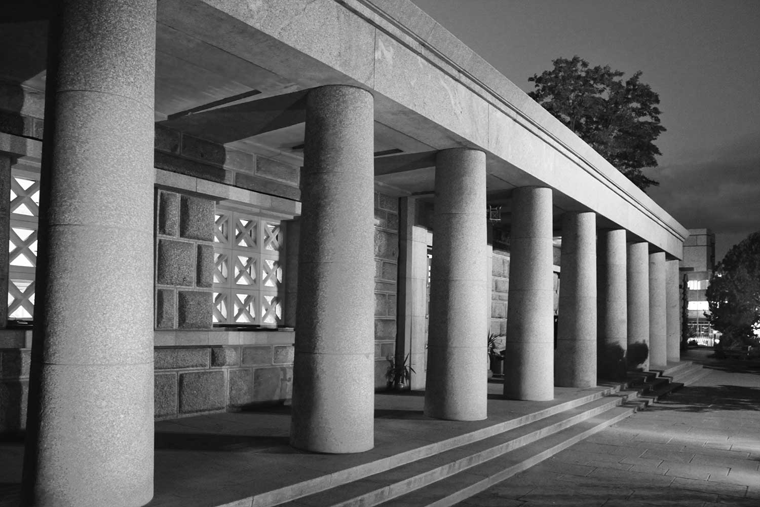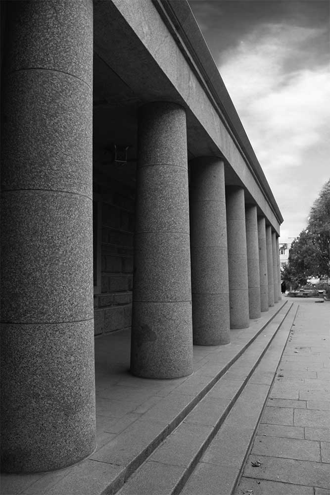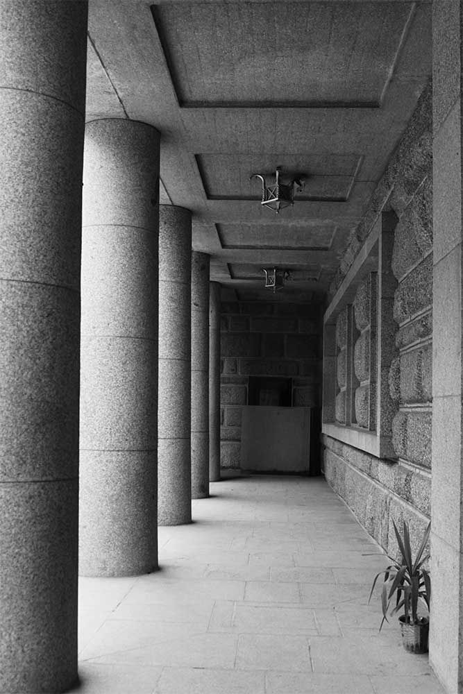 “The square recurs throughout — in the plan of the hall, the portico ceiling, the window lattices, the marble base, even the lamps and doors. Over five hundred squares, of different scales and placements, form the architectural rhythm of the building, each with its own symbolic meaning.”