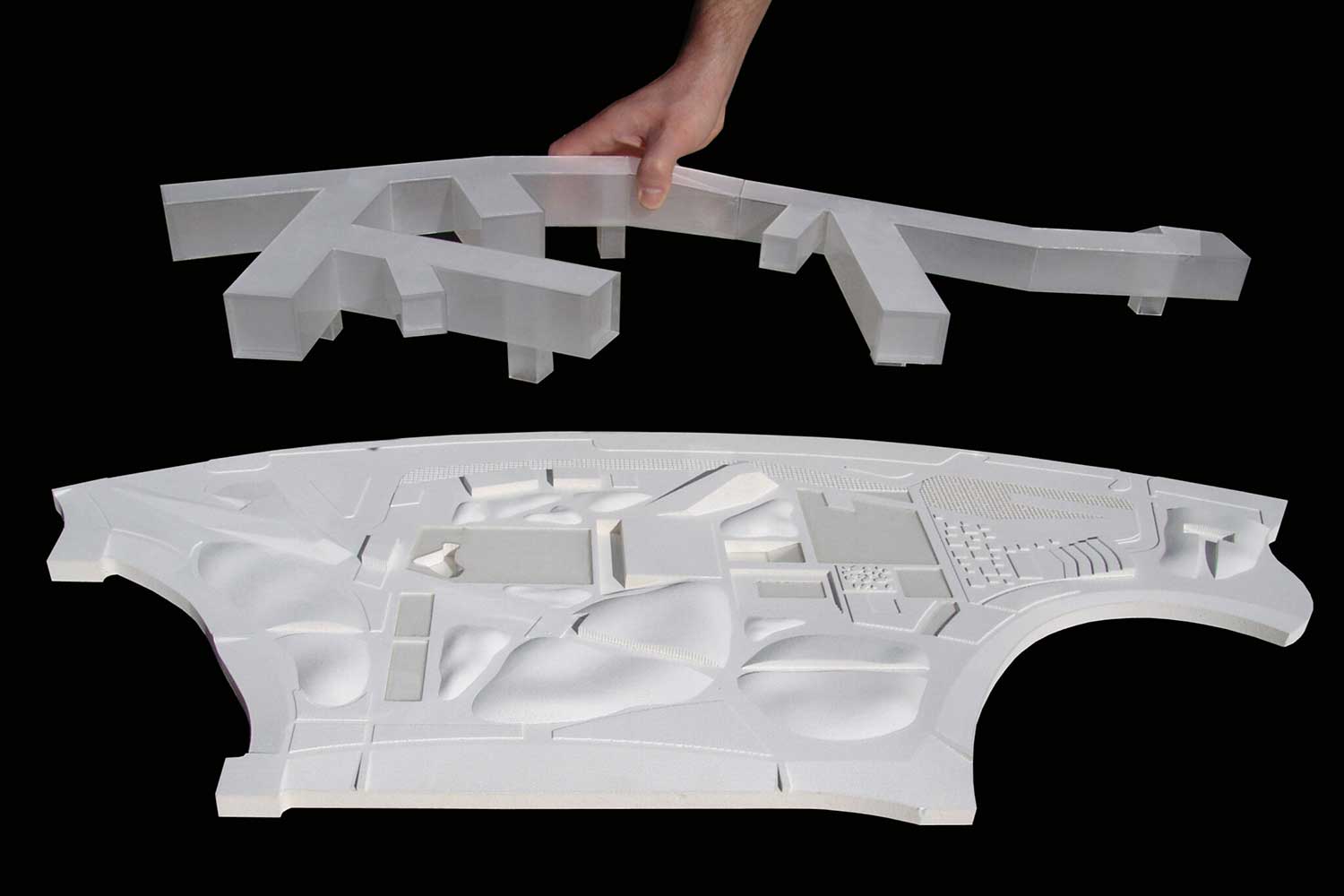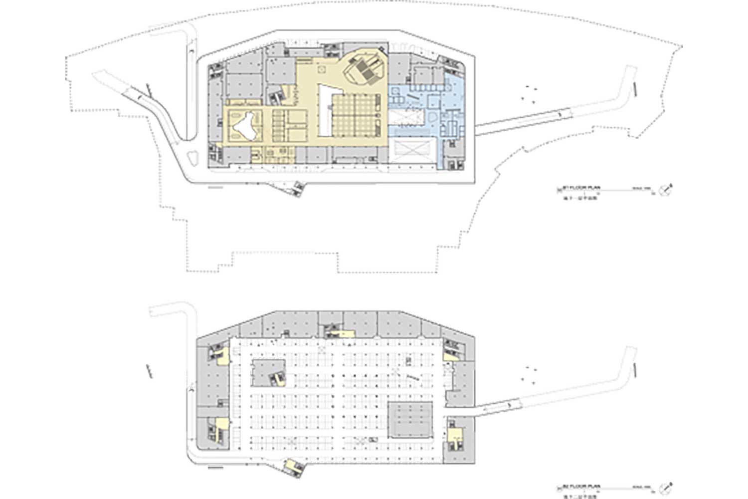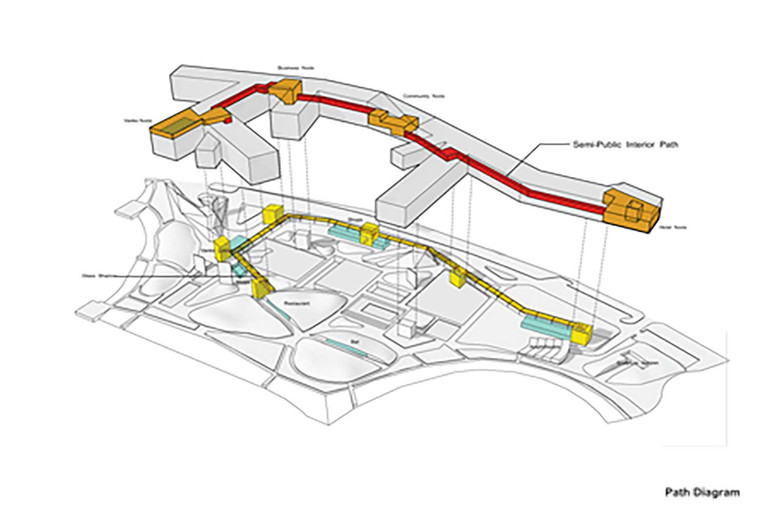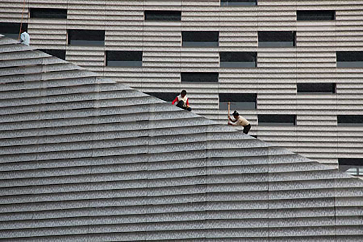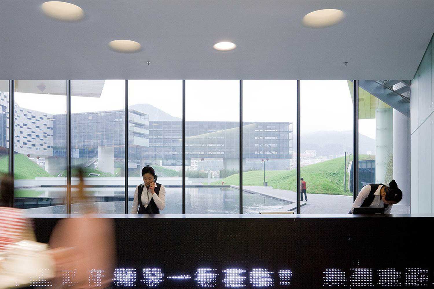 To reduce dependence on conventional energy sources, the architects installed 15,000 square feet of photovoltaic panels on the building’s roof. They estimate that these solar cells will provide 12.5 percent of the headquarters’ total electricity needs. Throughout the project, Holl’s team specified products made from renewable materials. For example, the architects used bamboo for doors, floors, and furniture, and carpet tiles with vinyl backing made from recycled carpet and manufacturing waste. All paints, finishes, and adhesives in the building have either few or no VOCs. To conserve potable water, the building is equipped with low-flow, highly efficient plumbing fixtures and waterless urinals. In addition, dual-flush toilets use recycled graywater. Outdoors, rainwater filtered by the bio-swale system is used to irrigate the grounds. Holl worked with engineers at the China Academy of Building Research to design an innovative structural system that combines a high-strength concrete frame with the kind of steel cable-stay technology most often used on bridges. The solution eliminated the need for large trusses that would have impaired views from office areas and disrupted interiors more than the angled cables that were used. These cables transmit the building’s vertical load to key structural elements such as reinforced-concrete cores, walls, and columns and then to the foundation. Like Holl’s Linked Hybrid in Beijing, the Vanke headquarters combines different functions in one complex—an 86,000-square-foot conference center tucked into green-roofed mounds at its base, 214,000 square feet of hotel space, and 211,000 square feet of condominium apartments.