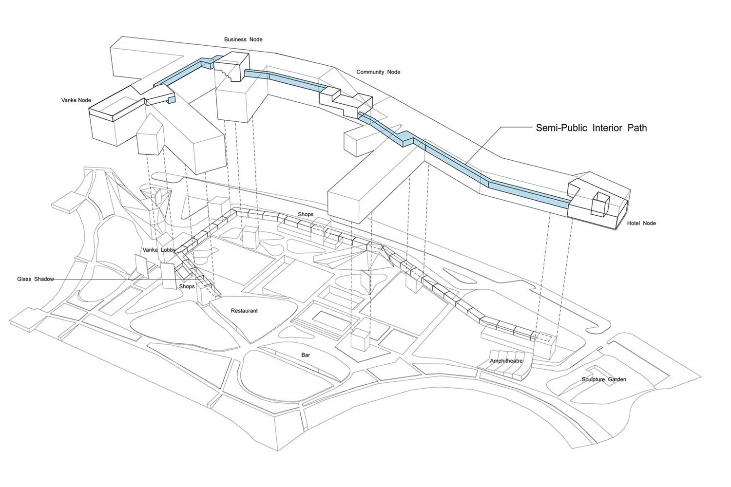 Vanke Center عملکردهای اداری، مسکونی و هتلی را در یک ساختمان طولی گرد آورده است: شامل مرکز همایش با ۸۶٬۰۰۰ فوت مربع، فضای هتل با ۲۱۴٬۰۰۰ فوت مربع، و آپارتمانهایی به مساحت ۲۱۱٬۰۰۰ فوت مربع. پارکینگ نیز عمدتاً زیرزمین طراحی شده تا فضاهای روی زمین برای کاربری عمومی آزاد باقی بماند.