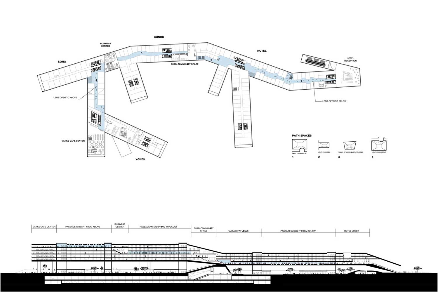Parking is mostly underground. Because the office, condo, and hotel functions all occupy one long building, the scheme offers flexibility in terms of the amount of space allocated to each segment. While some people question China’s commitment to sustainability, Holl says all of his Chinese clients have asked for the greenest buildings possible. “In other parts of the world, clients want to nickel-and-dime sustainability, questioning every expenditure,” states the architect. “Chinese clients aren’t thinking that way. They’re thinking of building the future.”