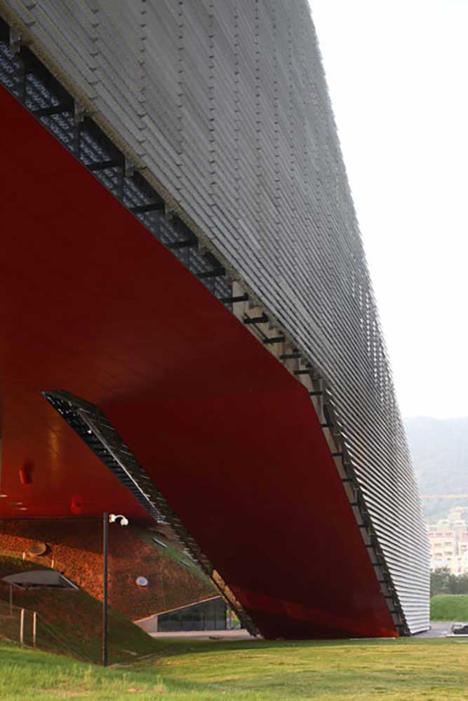 Raised on eight sculptural cores spaced up to 50 m apart, the massive 1.3 million ft² (≈ 120 000 m²) bar floats, naturally framing views to the South China Sea. The space beneath becomes a verdant amphitheater: