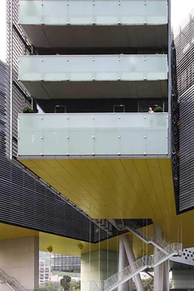 - Raised above the ground, the colorful underside of the building serves as a horizontal facade.