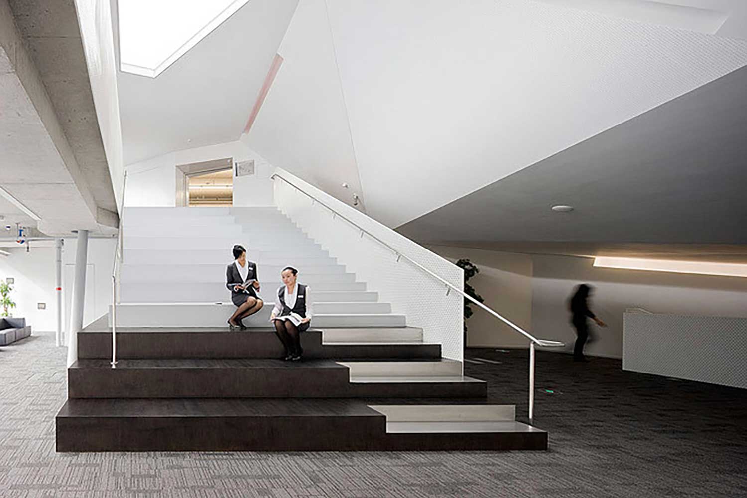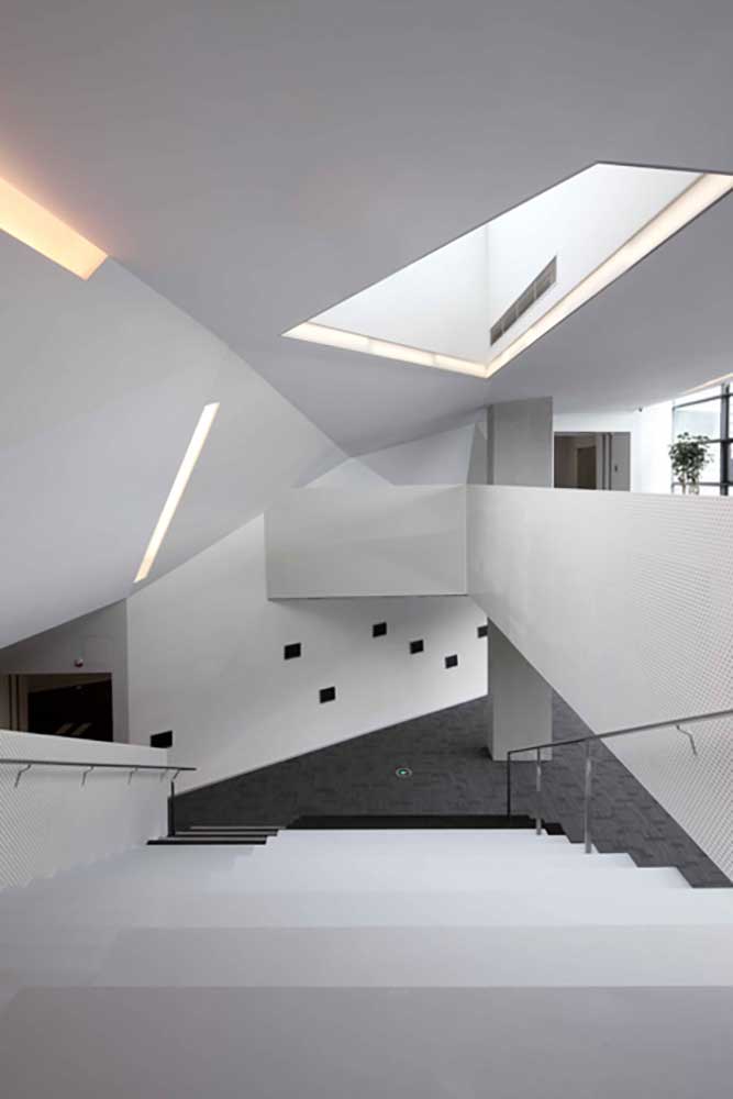 - نور طبیعی از بالا وارد میشود تا پلکان بزرگ مرکزی را روشن سازد و نیاز به نورپردازی مصنوعی را کاهش دهد.