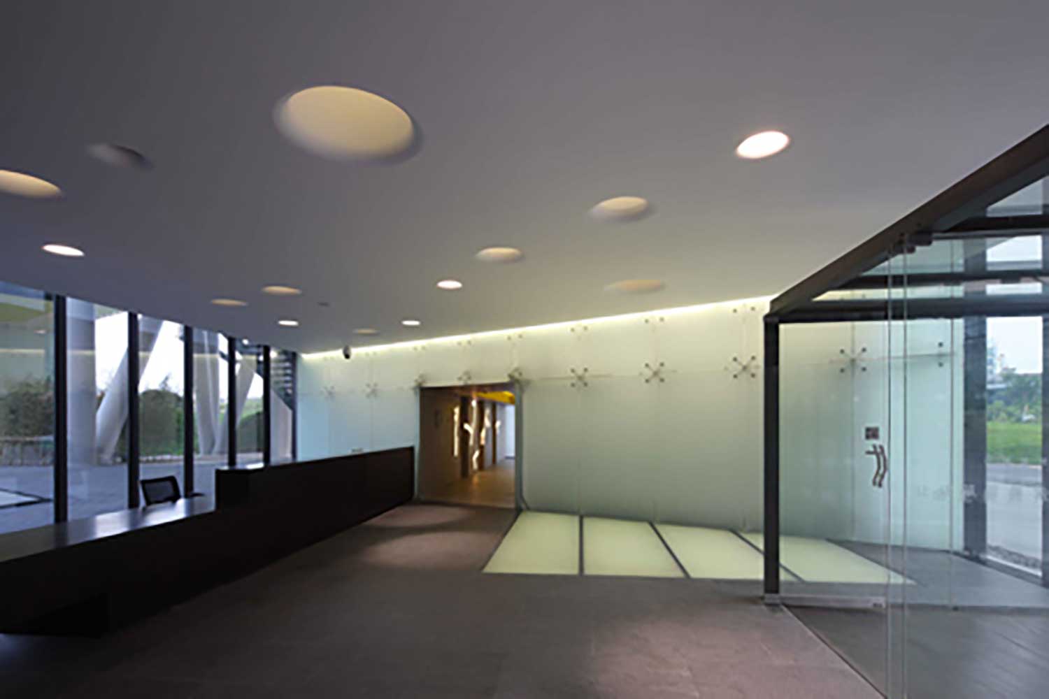 The building’s structure combines a reinforced concrete frame with steel cable-stay technology typically found in bridge design. This approach eliminates the need for large trusses, preserving interior visual continuity and open spatial experience. Angled cables transfer the vertical load to concrete cores, walls, and columns.