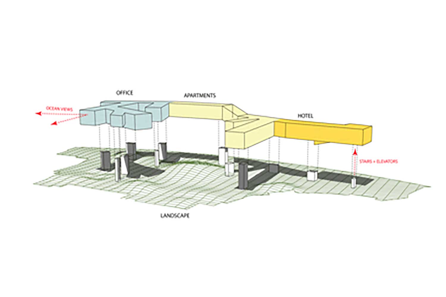 A public promenade running the full length, connecting hotel, apartments and offices in one continuous journey.