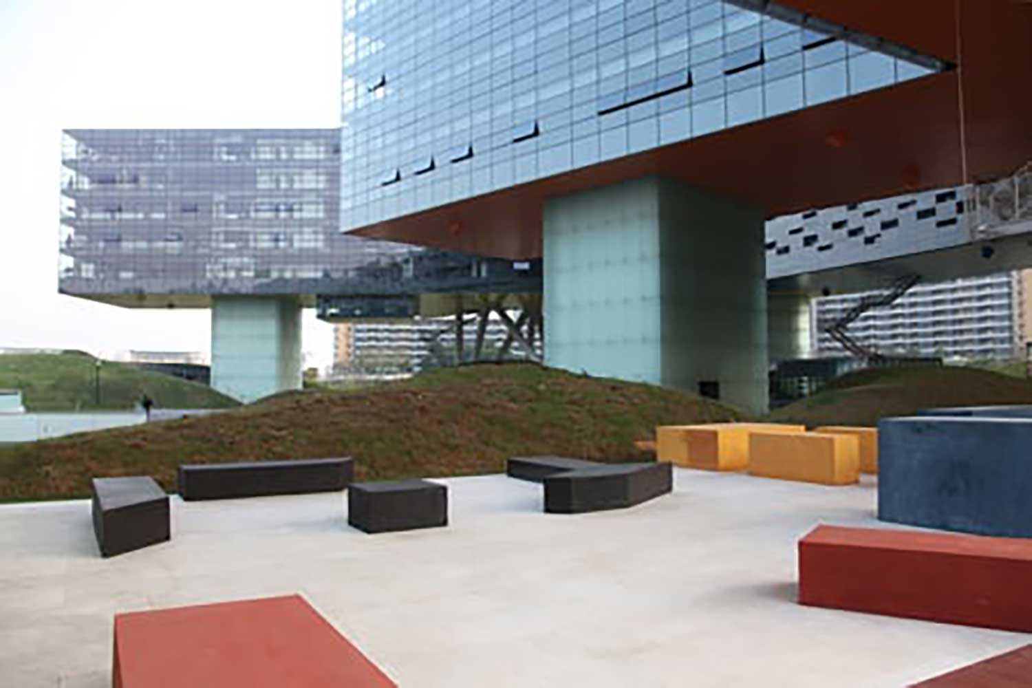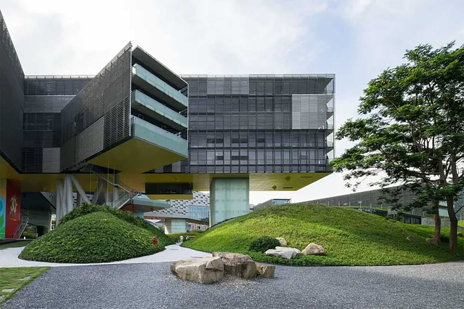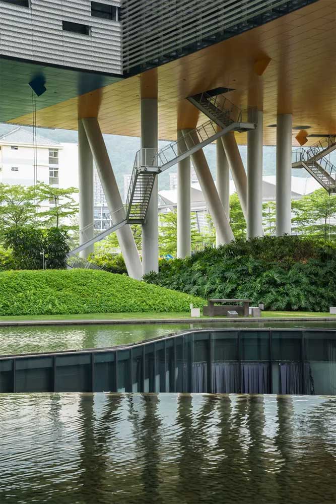 Suspended 15 meters above the ground on eight semi-transparent glass piers, the building creates a public green park underneath while breezes from the South China Sea cool the structure naturally. It introduces temperate microclimates to an otherwise hot and humid region—an innovative use of climate-responsive design.