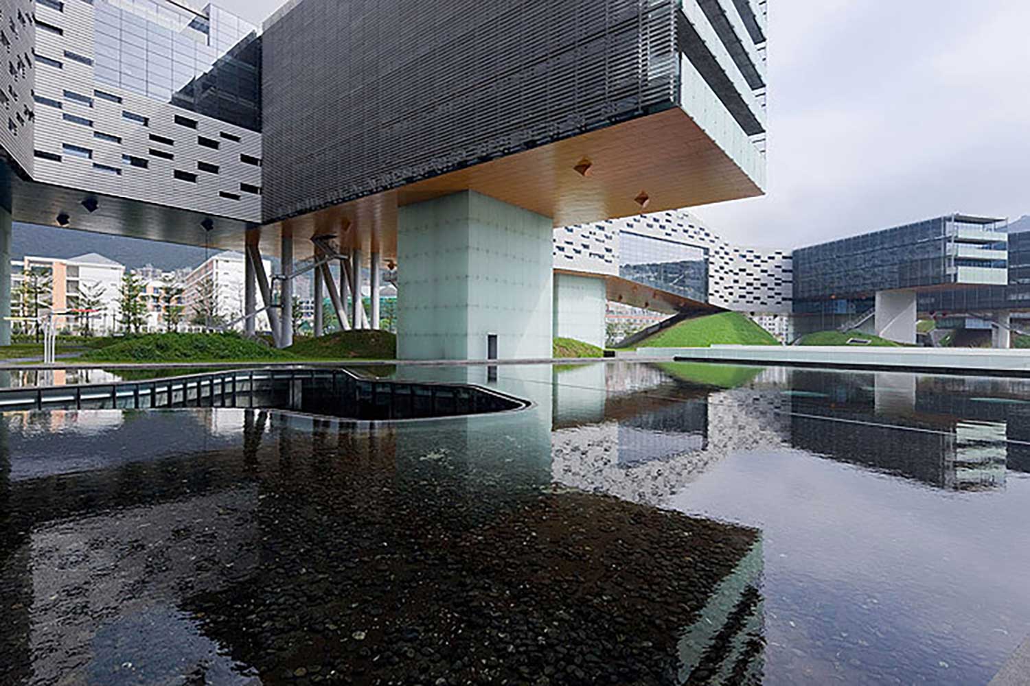 مجموعهای از حیاطها، باغهای فرورفته، حوضچهها و تپههای کاشتهشده، سامانهای گردشپذیر ایجاد میکند که آبهای سطحی را تنظیم کرده و در سراسر سایت بازتوزیع میکند. در مناطقی که نیاز به پوشش سخت بود، معماران مصالحی نفوذپذیر مشخص کردند؛ مانند سنگریزههای محلی، شن، سنگفرشهای باز (open-joint)، بتن چمنی (grass-crete) و کفپوشهای فشردهشدهی ماسهای که قادرند آب را جذب کرده و بهصورت طبیعی تصفیه کنند. «منظر این پروژه در واقع یک ماشین است برای تصفیهی آب و معتدلکردن اقلیم عمل میکند،» استیون هال میگوید. از آنجا که ساختمان بالاتر از سطح زمین قرار گرفته، نسیمهایی که از دریای جنوبی چین میوزند از زیر آن عبور کرده و موجب خنک شدن فضا میشوند. این ساختمان در منطقهای از جهان که به گرما و رطوبت شهرت دارد، ریزاقلیمهایی معتدل ایجاد میکند، هال توضیح میدهد. بالا بردن ساختمان همچنین به فضاهای داخلی دید بهتری از دریا (در جنوب) و کوهها (در شمال) میدهد. صفحهی کف دراز و باریک ساختمان تضمین میکند که کارکنان اداری بتوانند عمدتاً با نور طبیعی کار کنند.پنجرههای بزرگ قابلبازشدن به عرض ۶.۶ فوت، وابستگی به تهویهی مکانیکی را بهویژه درماههای خنکتر سال (نوامبر تا مارس) که در آن تهویهی طبیعی میتواند در بیش از ۶۰٪ مواقع جایگزین سیستم مکانیکی شود—طبق برآورد مهندسان شرکت Transsolar. پنجرههای قابل بازشدن همچنین میتوانند مصرف انرژی الکتریکی را سالانه تا حدود یکچهارم یا ۵ کیلوواتساعت بر مترمربع کاهش دهند. «مواجهه با اقلیم گرم و مرطوب و نوسانات اندک دمای روزانه، بزرگترین چالش ما بود،» میگوید پیتر وویت (Peter Voit)، شریک مسئول در شرکت Transsolar. «اما ما محاسبات دقیقی درباره عملکرد سایهاندازها انجام دادیم و سیستمی از لوورهای ثابت و پنجرههای قابلبازشو طراحی کردیم که در فصل زمستان، شرایطی بسیار راحت با تهویهی طبیعی فراهم میکند.» شیشههای با عملکرد بالا، همراه با دو پوشش Low-E و سیستم طراحیشدهای از لوورهای آلومینیومی سوراخدار، دیوار پردهای (curtain wall) ساختمان را در برابر تابش مستقیم خورشید محافظت میکند. برای دستیابی به بیشترین حفاظت در کنار بیشینهکردن نور روز و دید، معماران برای هر یک از ۲۶ نمای ساختمان ارتفاع متفاوتی طراحی کردند—و میزان لوورهای ثابت و متحرک و اندازهی سوراخهای آنها را بر اساس جهتگیری خورشید تنظیم کردند. سیستمی کنترلشده با رایانه و حسگر، بهصورت خودکار لوورهای قابلتنظیم را بر اساس حرکت و شدت نور خورشید تنظیم میکند.