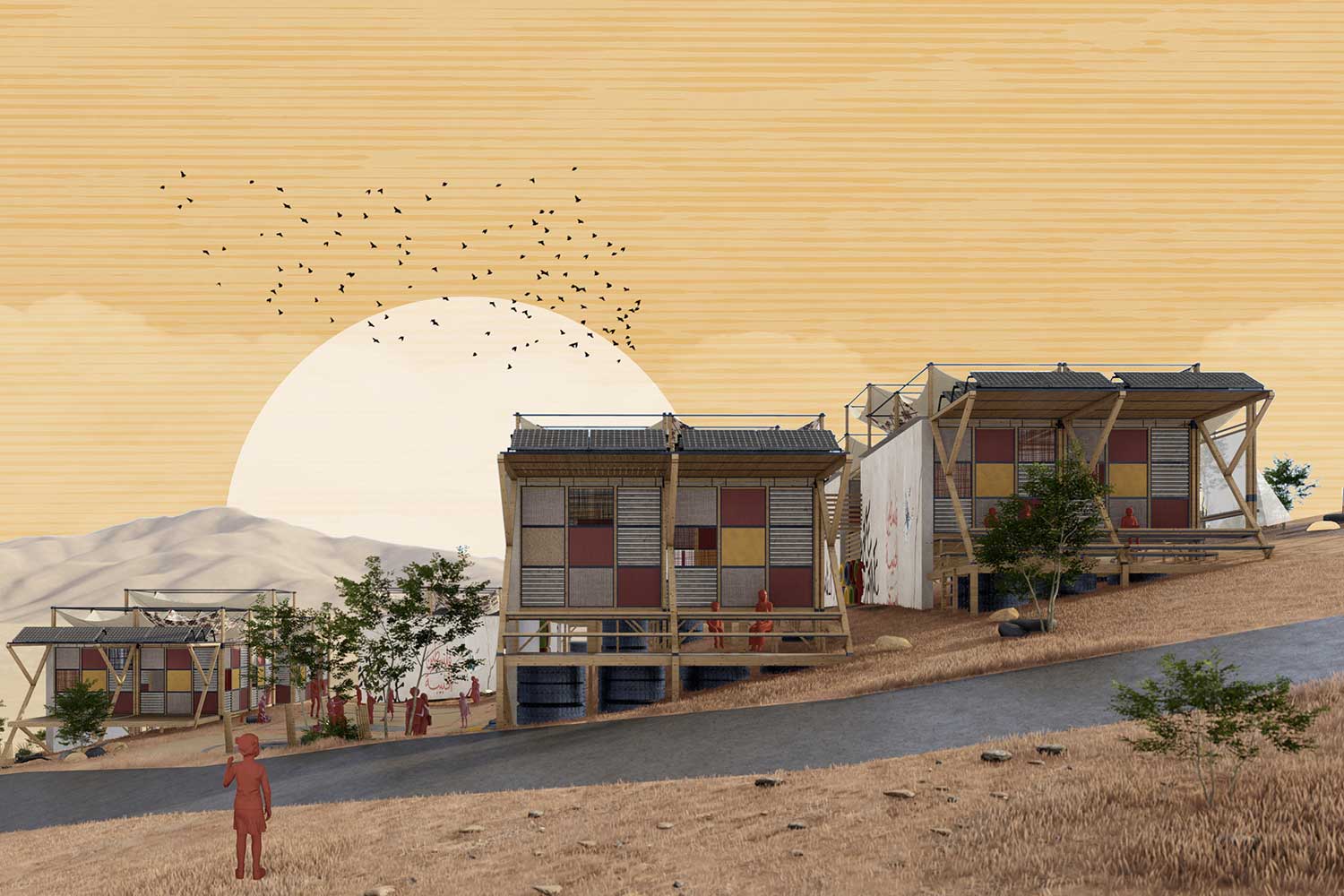 این پروژه در پاسخ به کمبود زمین شهری، شامل میکروآپارتمانهایی با مساحت حداکثر ۲۵ مترمربع است که در دامنهای کوهستانی و مستعد آتشسوزی طراحی شدهاند. چالش اصلی، ایجاد سکونتگاههایی مقاوم در برابر آتش بود که همزمان کیفیت معماری را حفظ کنند. با بهرهگیری از شیب سایت، آرایش پلکانی واحدها نور، دید و تهویهی بهینه را تضمین میکند. حیاط مرکزی محصور با دیوارهای بتنی عایق، هم فضای جمعی و هم سامانهی دفاع غیرفعال در برابر آتش است. واحدهای نیمهمدفون از ویژگیهای حرارتی و حفاظتی زمین بهره میبرند، در حالی که غنای فضایی حفظ میشود.