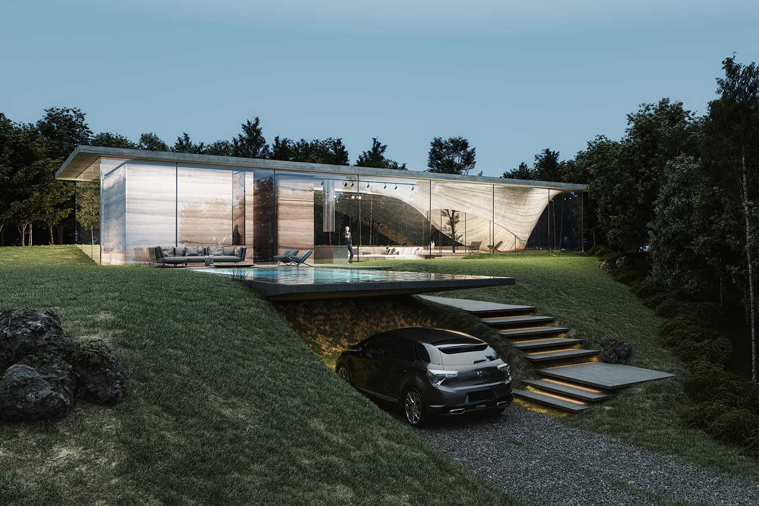 این ویلا بهعنوان کاوشی در هندسهی سیال و تداوم فضایی طراحی شده و از زبانی پیکرهوار با منحنیهای روان، حجمهای کنسولی و گذارهای بیوقفه میان صفحات افقی و عمودی بهره میبرد. سازهی اصلی با بتن اکسپوز با بافتپردازی مشخص اجرا شده که هم صداقت مصالح و هم هویت بصری قدرتمندی ایجاد میکند. شیشه عنصری کلیدی در طراحی است؛ دیوارهای پردهای تمامقد و شیشههای گوشهپیچ، مرز میان درون و بیرون را محو کرده و بیشینهی نور طبیعی را فراهم میکنند…