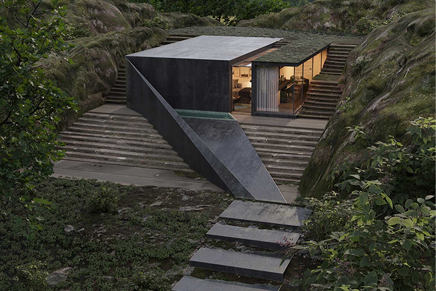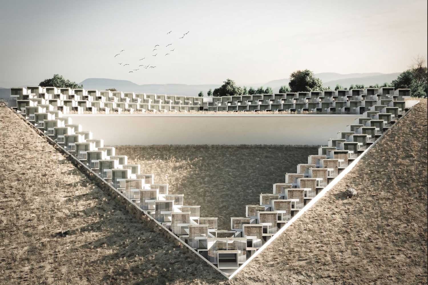 In response to urban land shortages, this project features micro-apartments—each no larger than 25 sqm—designed on a wildfire-prone mountainside. The main challenge was to create fire-resistant housing that still delivers architectural quality. Using the site’s slope, a stepped configuration ensures optimal light, views, and ventilation. A central courtyard enclosed by insulated concrete walls acts both as a communal space and passive fire defense. The partially buried units benefit from the earth’s thermal and protective properties while maintaining spatial richness.