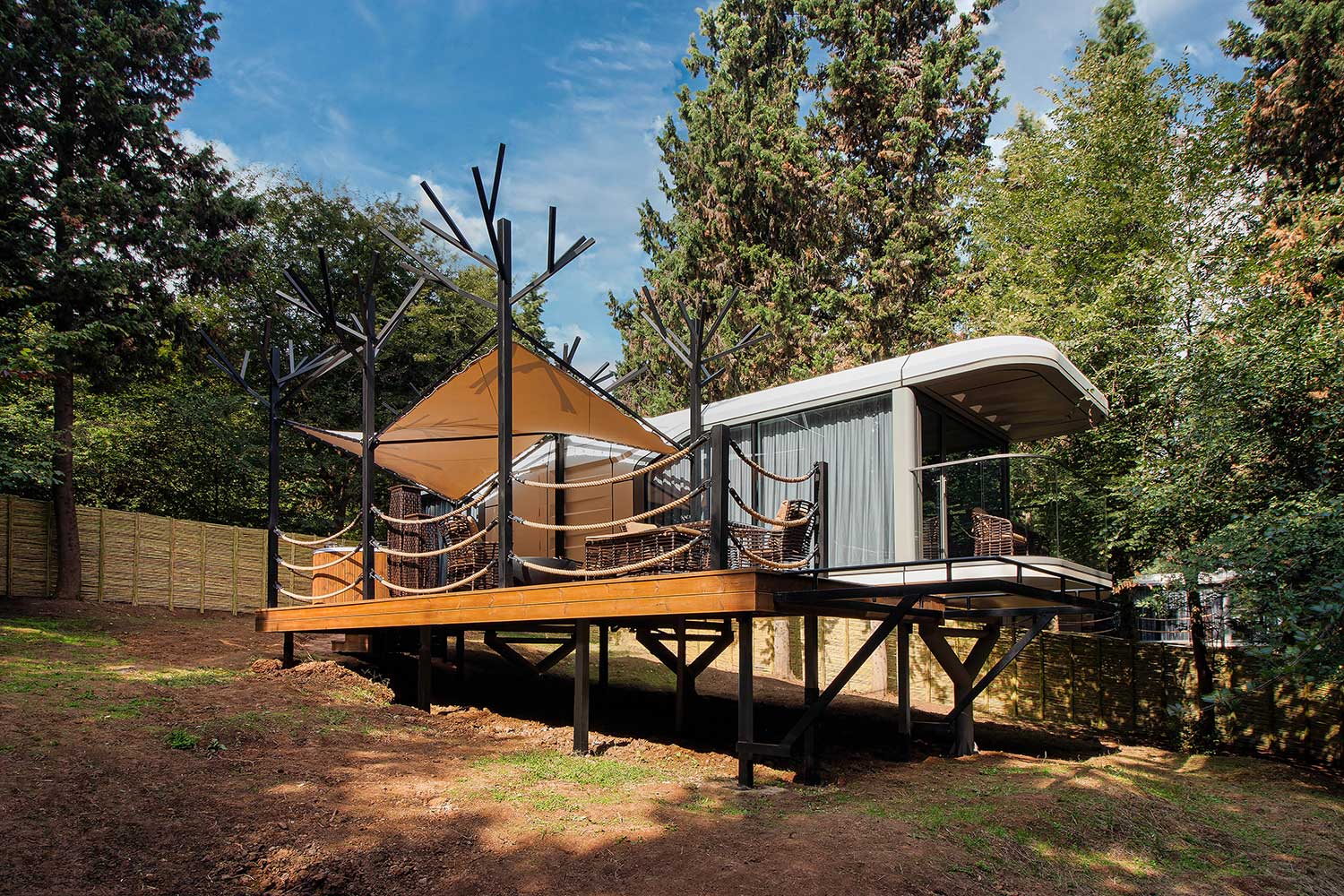 این کابین معلق پیشساخته در دل جنگلهای بکر هیرکانی، پناهگاهی سازگار با محیطزیست ارائه میدهد که فناوری و طبیعت را در هم میآمیزد. سازه با فاصله از زمین معلق شده تا بستر جنگل حفظ شود و دارای سکویی چوبی است که بر ستونهای فولادی بهشکل درخت تکیه دارد. نردههای طنابی کنفی، پوشش تنههای درخت و حصارهای ساختهشده از نی محلی، حریم خصوصی را تضمین میکنند. کفپوش پوستهی درخت، حس غوطهوری در طبیعت را تقویت میکند. این طراحی، نوآوری مدولار، حساسیت اکولوژیک و هماهنگی زمینهای را در تجربهای پایدار از معماری متجلی میسازد.