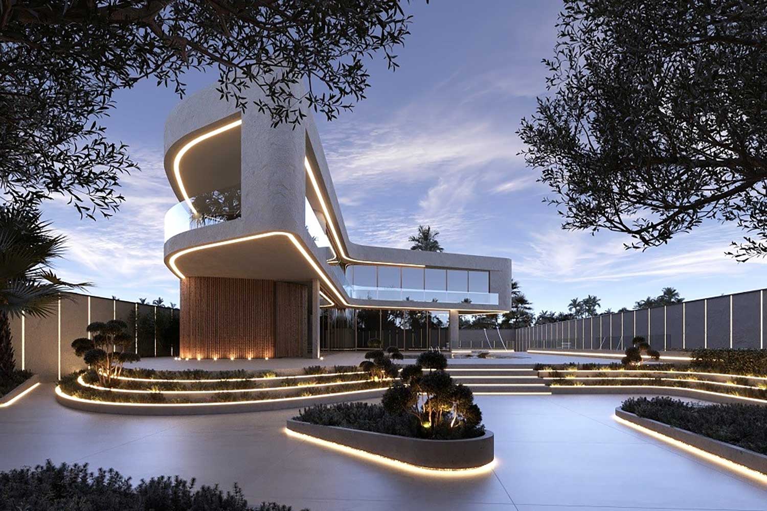 The villa is conceived as an exploration of fluid geometry and spatial continuity, utilizing a sculptural architectural language defined by sweeping curves, cantilevered volumes, and seamless transitions between horizontal and vertical planes. The primary structure is articulated through exposed concrete with a textured finish, providing both material honesty and a strong visual identity. Glazing is a key design element, with full-height curtain walls and corner-wrapped glass panels that dissolve boundaries between interior and exterior. This maximizes daylight penetration while offering pano