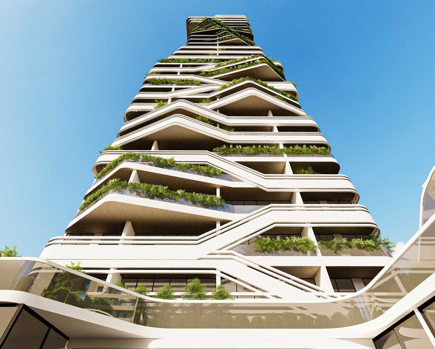 واحهای پرجنبوجوش برای اوقات فراغت که لوکسبودن عمودی را با جریان ارگانیک درهم میآمیزد. این برج مرتفع دارای بالکنهای پیکرهوار پوشیده از پوشش گیاهی سرسبز است که حرکت موجگونه را تداعی میکنند. طراحی، با استخرها و فضاهای باز سامانیافته، شیوهای تازه از زیست جمعی را در هماهنگی با آفتاب، طبیعت، جامعه و ظرافت معاصر بازتعریف میکند.