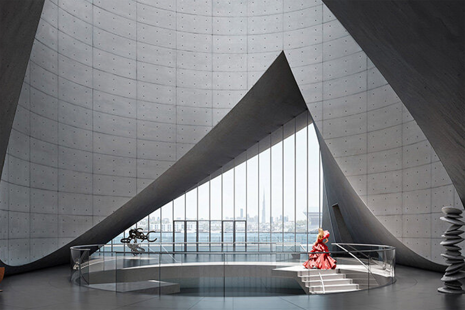 این موزه که توسط گروه الفطیم سفارش داده شده، بهعنوان یک امکانات عمومی و سکویی برای تبادل خلاقانه توسعه یافته است. طراحی آن به علاقهی همیشگی آندو به هندسه و نور اشاره دارد. در اینجا، این عناصر در یک محیط شهری و دریایی متمایز به هم میپیوندند. پوستهی خارجی ساختمان صاف و پیوسته است و یک منظر داخلی از حجمهای بتنی و خالیهای منحنی را پنهان میکند که حرکت را هدایت کرده و خطوط دید را قاببندی میکند.