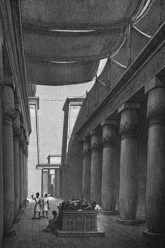 1.35: ویوله-لو-دوک (Viollet-le-Duc)، «نمای داخلی یک کاخ مصری»، از کتاب سکونتگاههای انسان در همه اعصار (1876)، این تصویر بازسازیشده، حیاط یک کاخ مصری بهسمت پیلُنهای ورودی نشان داده شده است. ستونها از نی ساخته و با گِل اندود شده بودند و سپس با نقوش رنگارنگ نقاشی میشدند.
