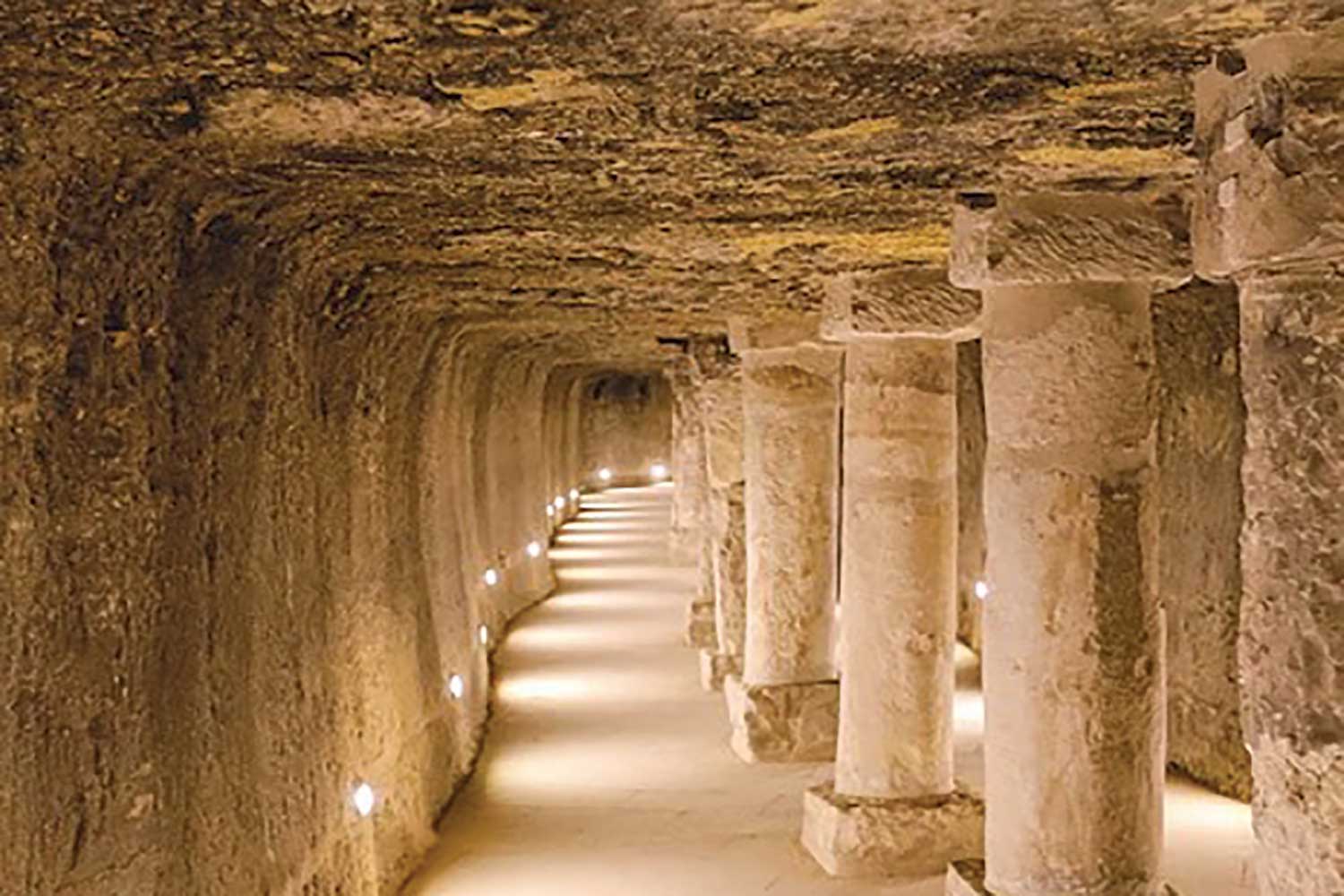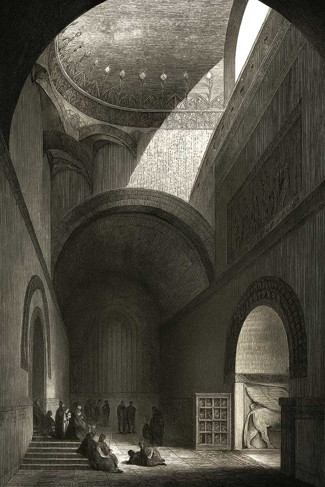 تصاویر آنوبیس، خدای مردگان با سر شغال، در کنار درهای شبیهسازیشده در هر دو طرف گذرگاه منتهی به اتاق داخلی که از تابوت رامسس دوم در مصر نگهبانی میکنند و سقفی که با خطوط هیروگلیف پوشیده شده است. اگرچه نیات پشت این تصاویر عرفانی است، فرم و رنگ آنها فضاهایی با تزئینات غنی و سبک مشخص هنر باستانی مصر خلق میکند.