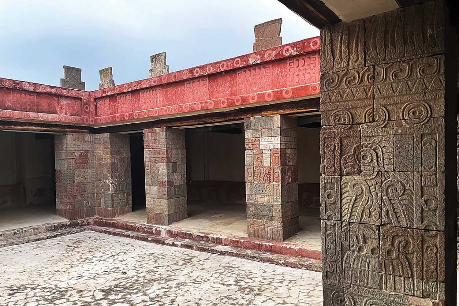 از جمله بناهای شاخص بازمانده، «کاخ کتزالکواتل» (Palace of Quetzalcoatl) از سدهی هفتم میلادی (Seventh Century C.E) است که شامل حیاطها (Patios)، ایوانها (Porticos) و دیگر عناصر معماری است و با نقشبرجستهها (Reliefs) تزئین شدهاند؛ عناصری که تصوری از ویژگیهای فضاهای داخلی به دست میدهند (تصویر 1.18). همچنین، نقاشیهای دیواری (Murals) در یک مجموعهی آپارتمانی بهجا ماندهاند که یکی از آنها شهرت دارد تصویری از الههی باروری (Fertility Goddess) را نشان دهد (حدود 650 میلادی؛ تصویر 1.19).