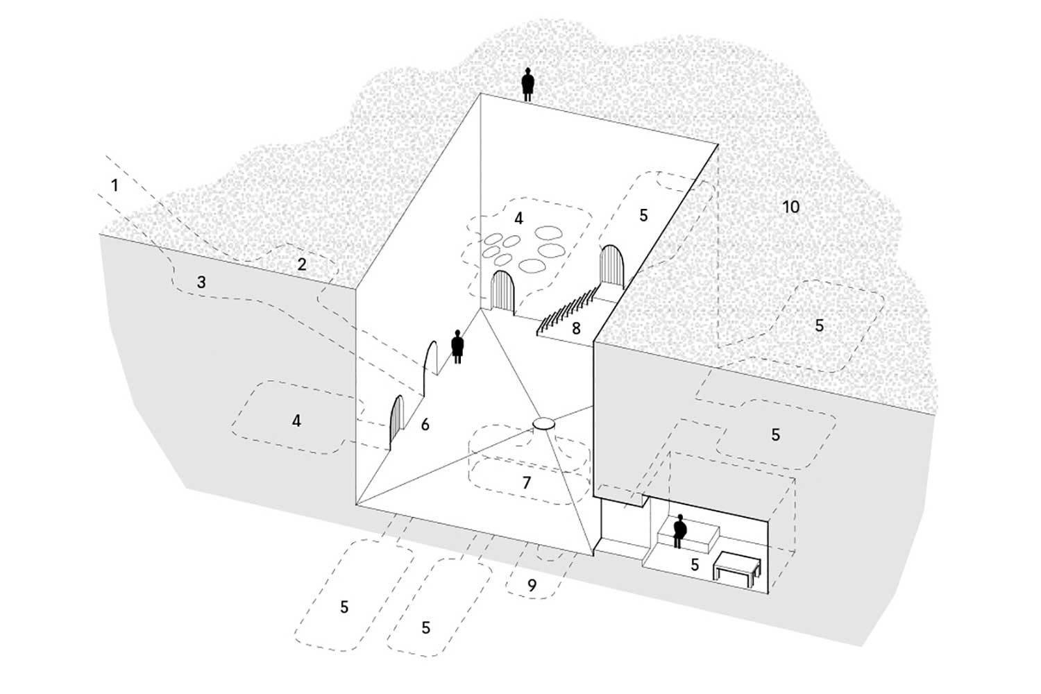 1.9: نقشه خانه ماتماتا (Drawing of a Matmata house)، این تصویر نموداری از یک خانه زیرزمینی متعلق به مردم ماتماتا در شمال آفریقا نشان میدهد: تونل ورودی (1) که از سطح زمین (10) آغاز میشود، با اصطبلهایی برای چهارپایان(2) و بز (3)، به حیاط مرکزی باز به آسمان منتهی میشود. اتاقهای خواب جداگانه (5) و سایر اتاقها [(4) انبارها و (9) آشپزخانه] در زمین اطراف حفر شدهاند و پلههایی (8) به برخی اتاقها دسترسی میدهند. یک مخزن آب (7) در مرکز حیاط آب را جمعآوری و ذخیره میکند.