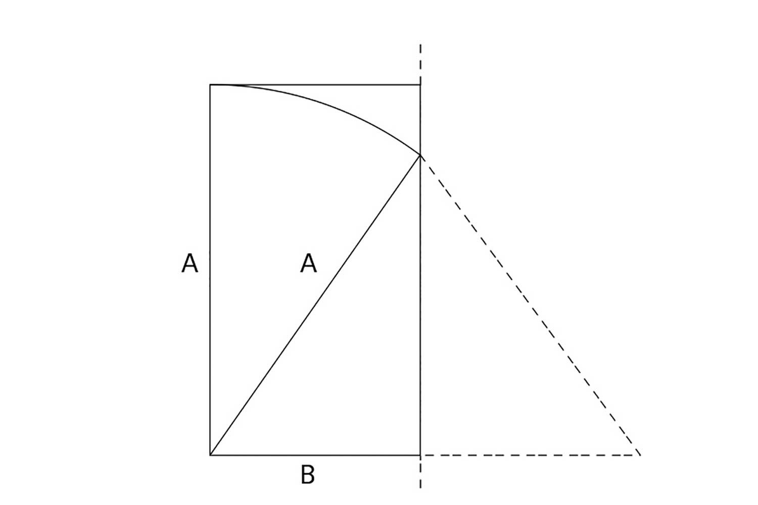 1.32: ترسیم نسبت طلایی (Construction of the Golden Ratio) با خطکش و پرگار، با استفاده از یک مستطیل طلایی، ضلع بلند (A) بهصورت قوسی به ضلع بلند مقابل منتقل میشود. مثلث حاصل، قاعدهای به اندازهی (B) و وتری برابر با (A) دارد و به «مثلث طلایی» (Golden Triangle) شهرت یافته است. زیر نویس تصویر 1.34 است بنظرم چک شود