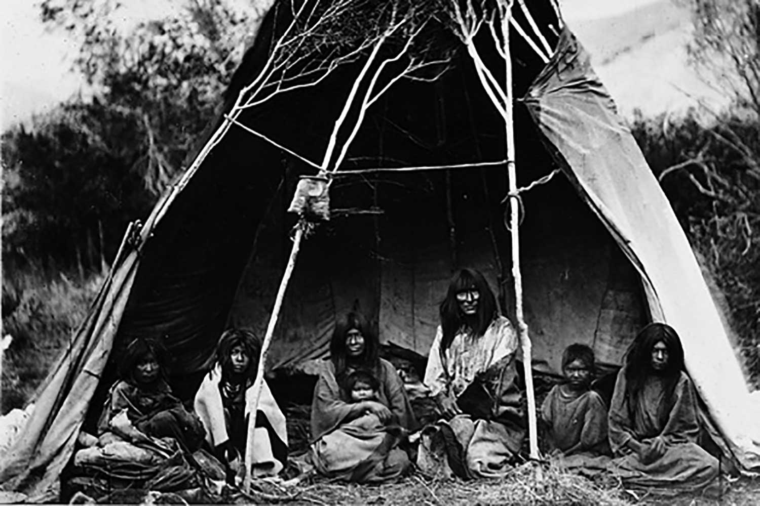 1,4: سرپناههای تیپی، عکس از ویلیام هنری جکسون، عکس خانواده باناک در نزدیکی مدیس لاج کریک، آیداهو، ۱۸۷۱ (William Henry Jackson, photograph of a Bannock family camped near Medice Lodge Creek, Idaho, 1871)