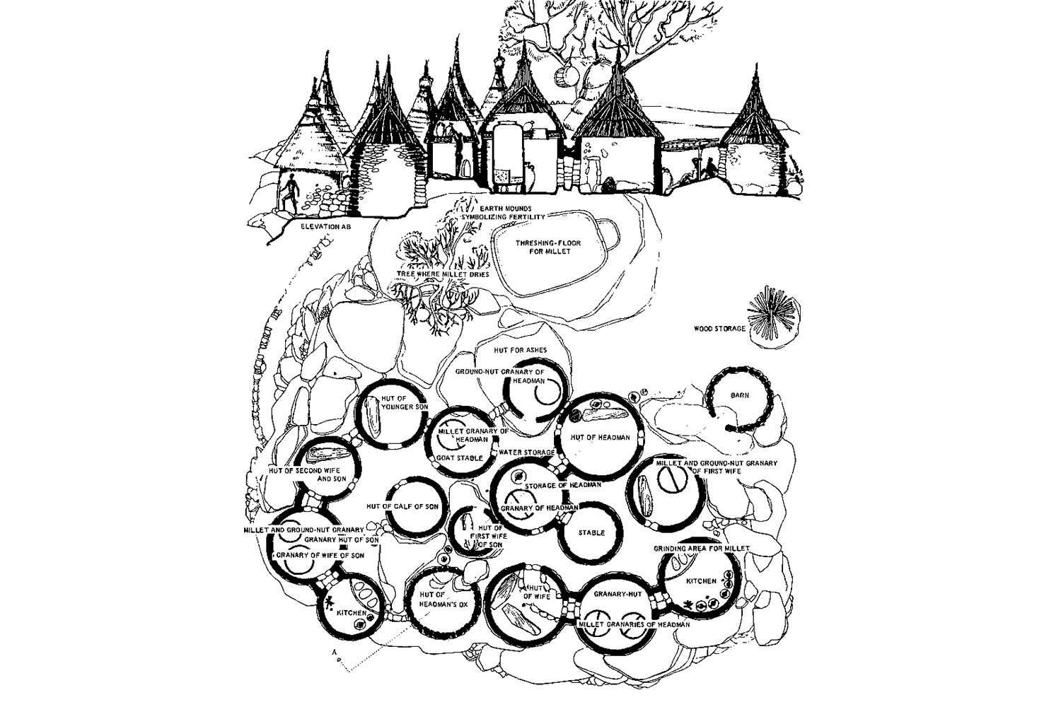 1.7: پلان و ارتفاع مقطعی یک خانه یا روستای قبیلهای ماتاکام در کامرون، آفریقا (Plan and sectional elevation of a Matakam homestead or tribal village in Cameroon, Africa)