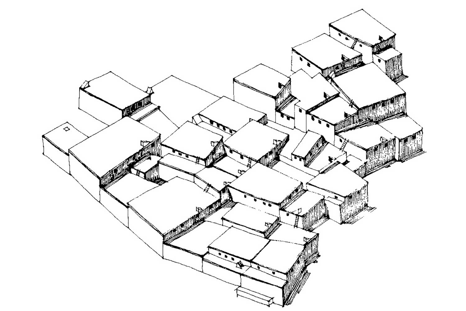 ۱,۱۲: نماهای بازسازیشده از ساختمانها و تالار پرستش در چاتال هویوک(Çatal Hüyük)، نزدیک قونیه، ترکیه، حدود ۶۵۰۰–۵۷۰۰ پیش از میلاد