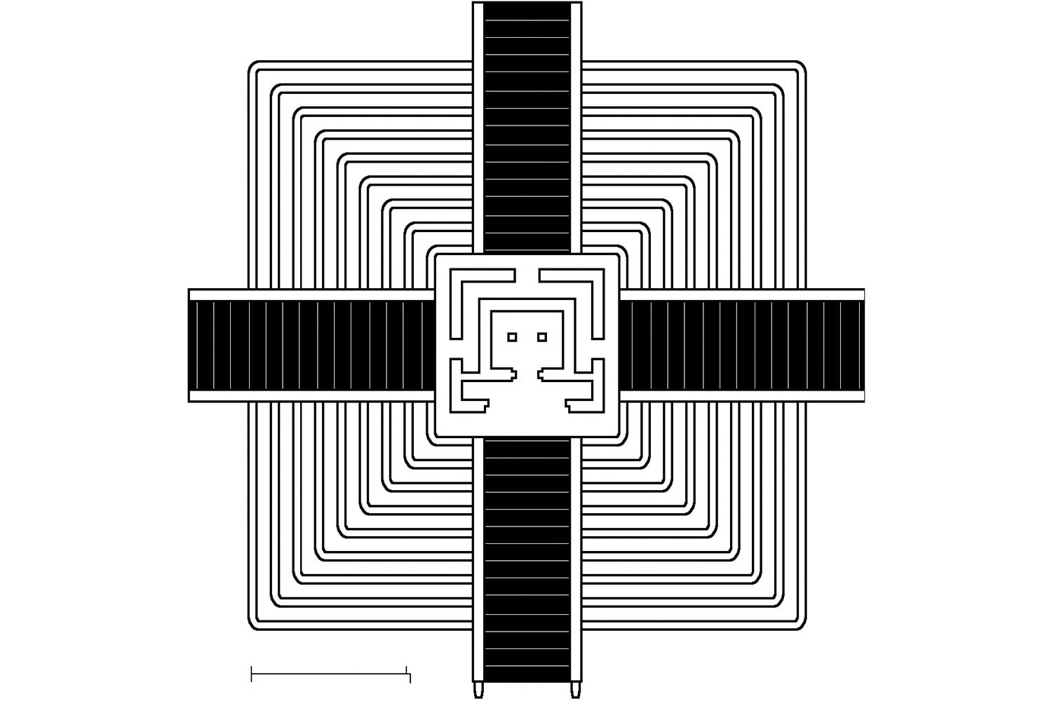 هرم پلکانی باشکوهی با ابعاد 180 فوت مربع و ارتفاع 78 فوت که معبدی بر فراز آن قرار دارد. طراحی داخلی این بنا بر پایهی «نسبت طلایی» انجام شده است؛ دیوارها بهگونهای جایگذاری شدهاند که فضاهای پیرامونی همچنان در نسبت 1:0.618 با تالار مرکزی ارتباط داشته باشند.