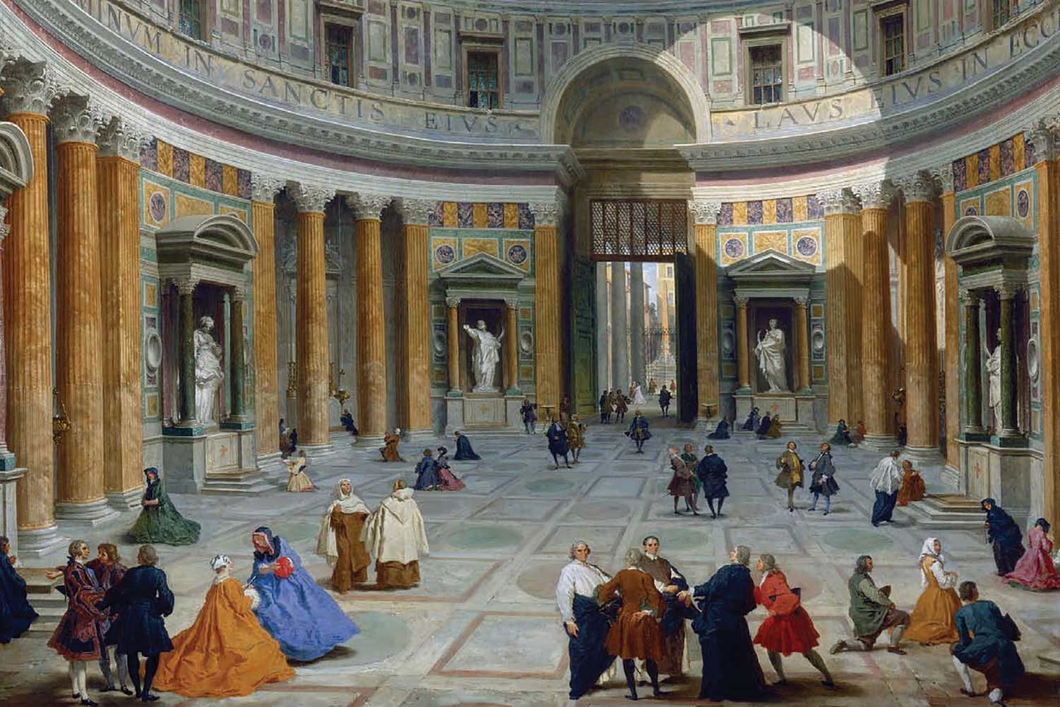 فضای بزرگی که با ستونهای متعدد پر شده باشد «تالار ستوندار» (Hypostyle Hall) نام دارد. تالار ستوندار عظیم معبد آمون (Temple of Amon) در کارناک (Karnak) که ساخت آن از حدود 1530 پیش از میلاد آغاز شد، 170×338 فوت وسعت دارد و شامل 134 ستون است که سطوح آنها با کتیبههای هیروگلیف حکاکیشده و رنگآمیزیشده پوشانده شدهاند (تصویر 1.34). ستونها از چندین قطعهی سنگی مدور ساخته شده و با سرستونهایی به شکل غنچه یا گل پاپیروس تزئین شدهاند. بخش مرکزی تالار از کنارهها بلندتر است و همین امر امکان ایجاد پنجرههای کلِرستوری (Clerestory Windows) را میدهد تا نور طبیعی وارد تالار شود.