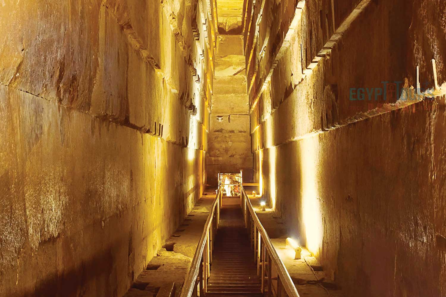 هرچند فضاهای داخلی در مقایسه با حجم عظیم کل هرم کوچکاند، اما شکل و روابط آنها بسیار پیچیده و معنادار است. یک گذرگاه به اتاق تدفین ساختگی منتهی میشود، در حالی که ورودیهای واقعی به مقبره با دقت پنهان شده بودند تا از ورود غارتگران جلوگیری شود. این هرم به فرمان فرعون خوفو (Khufu / Cheops) ساخته شده بود.