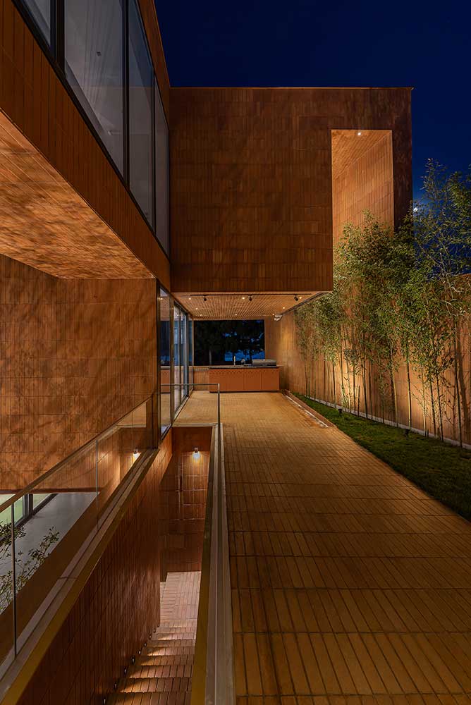 Although the floor plan adheres to conventional divisions of recreational, public, and private spaces, the interconnected void spaces and diverse access possibilities, which do not necessarily penetrate the interior areas, implicitly allow users to wander and explore within the building. Furthermore, the voids play another significant role by organizing the rooms as islands, while the use of brick color and material energizes the interior as a dynamic backdrop
