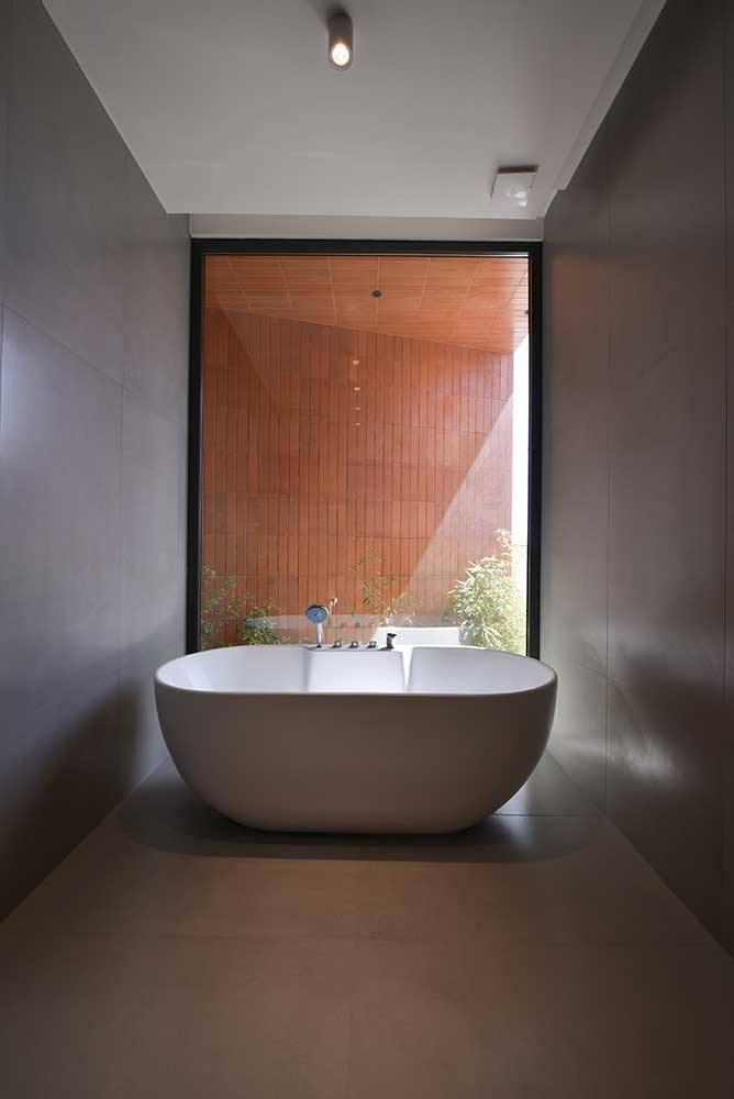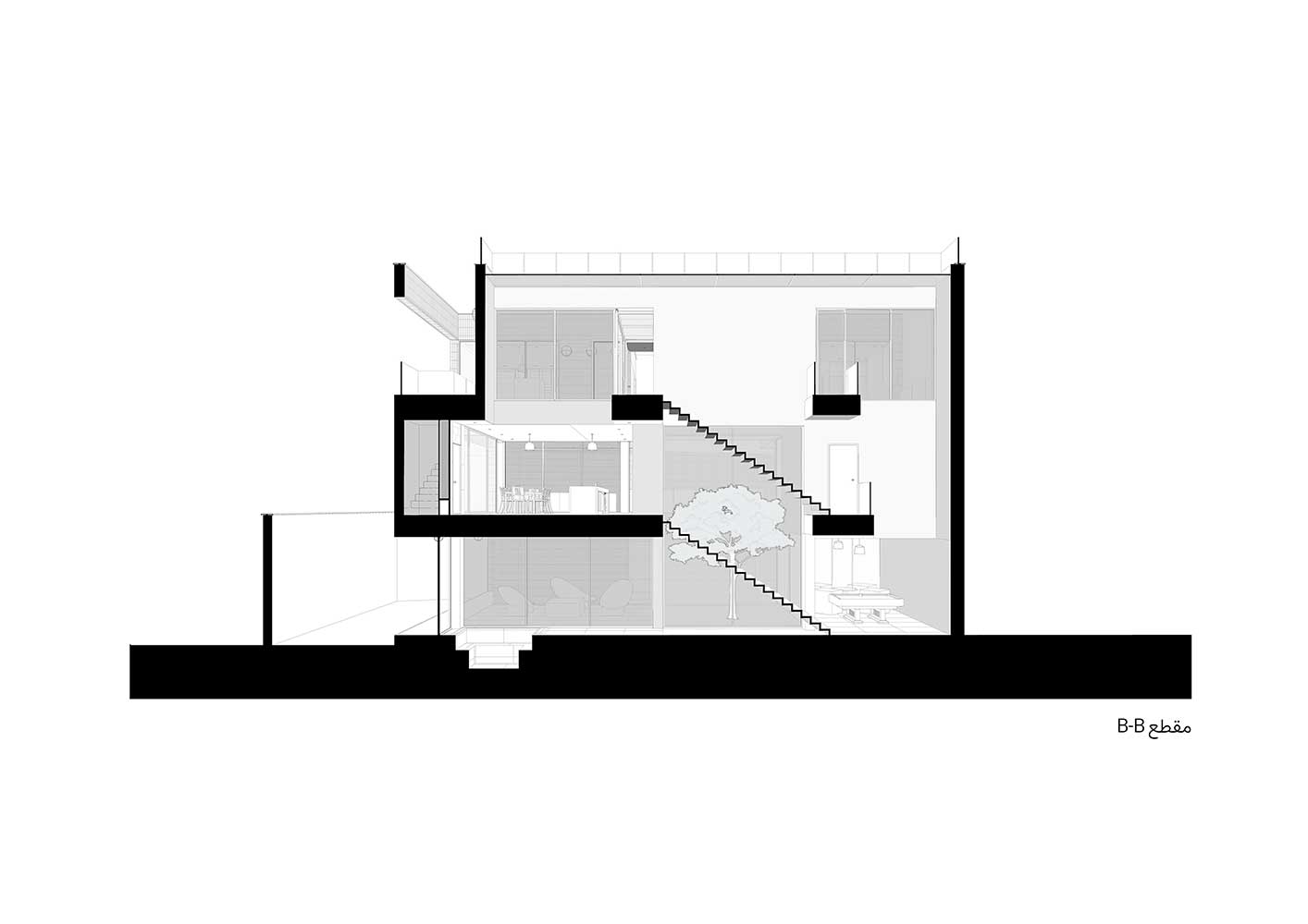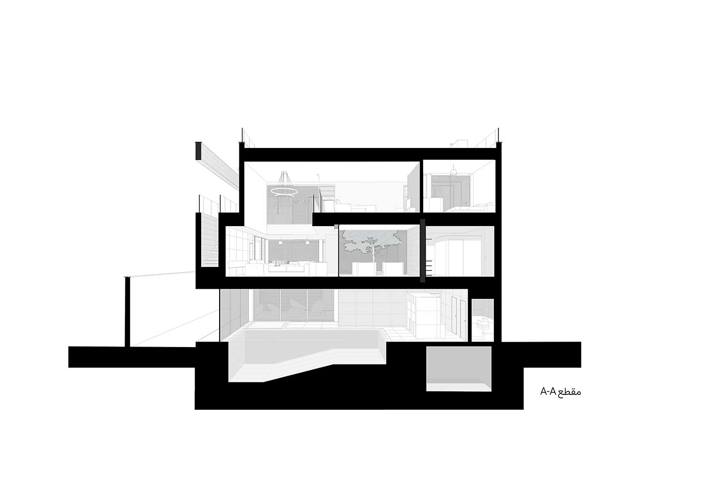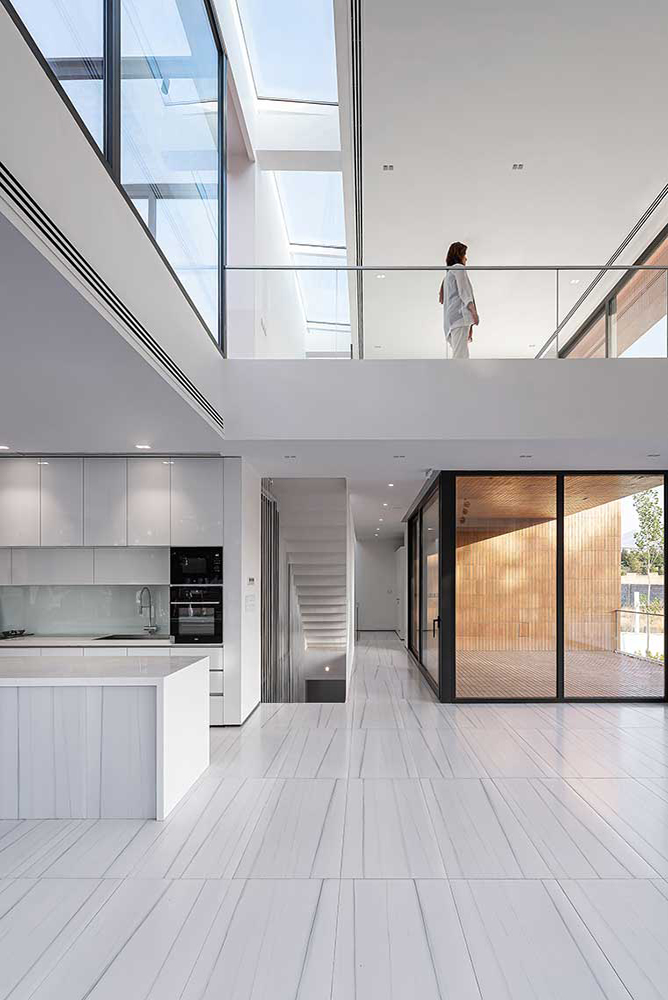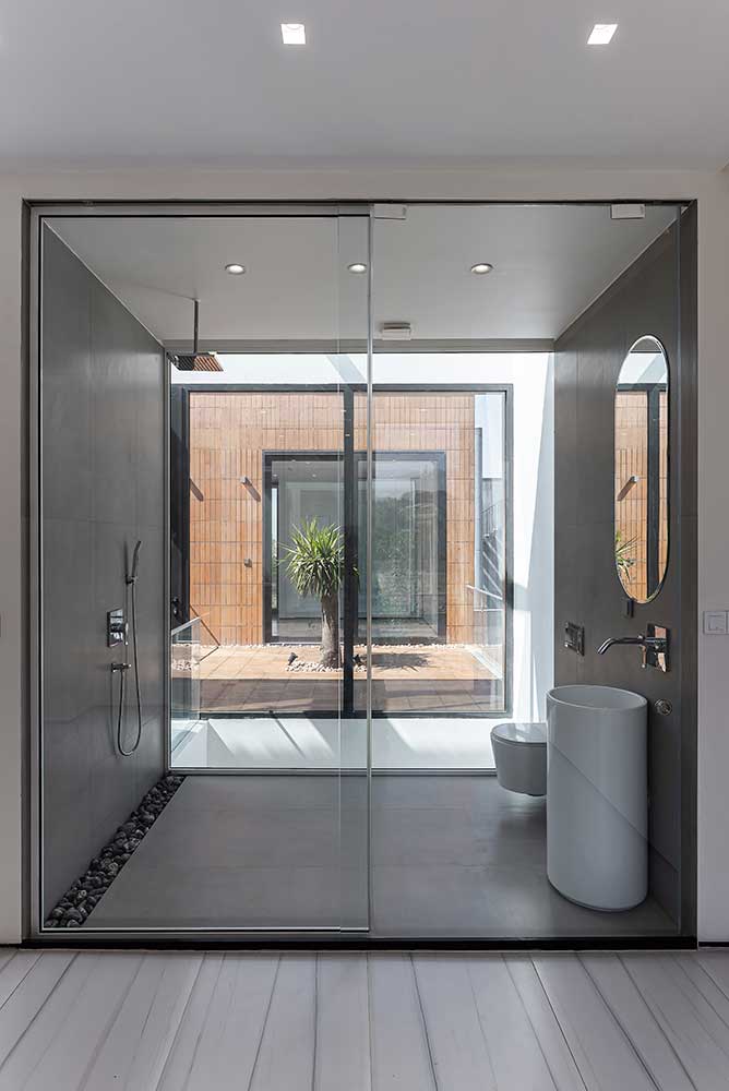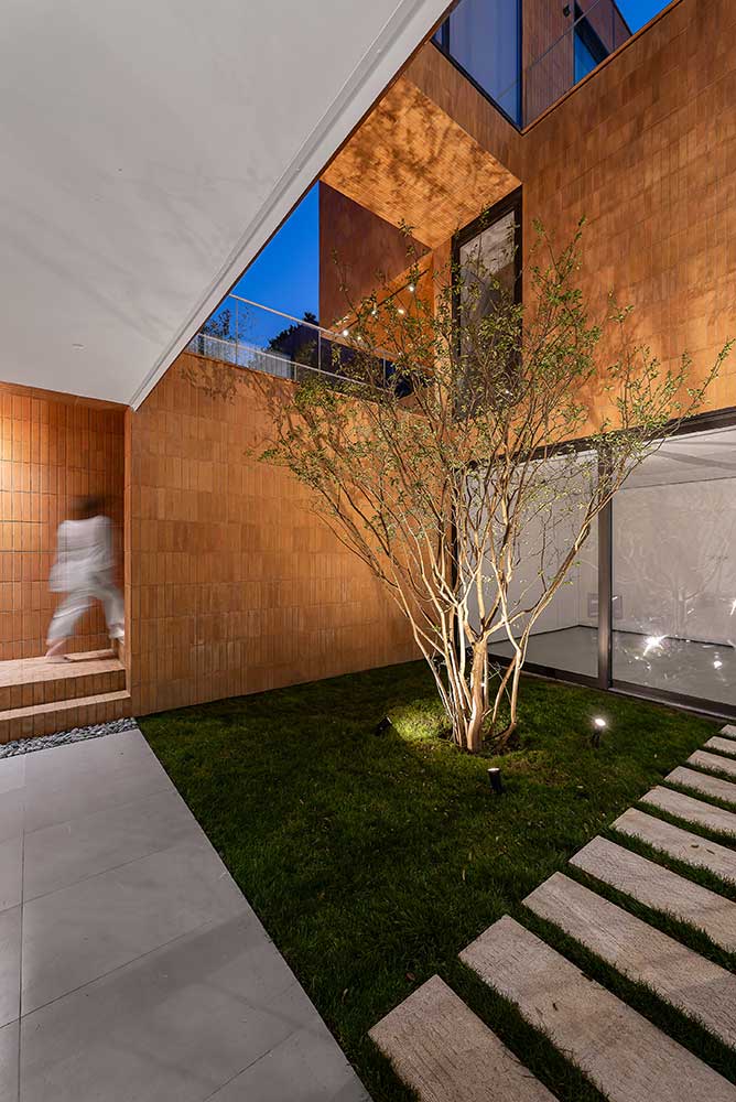 The semi-central courtyard, embedded within the project, interacts with both covered and open voids on all three floors to maintain a degree of continuity. Acting as a sturdy trunk, it unifies the spaces around it and conducts light down to the basement