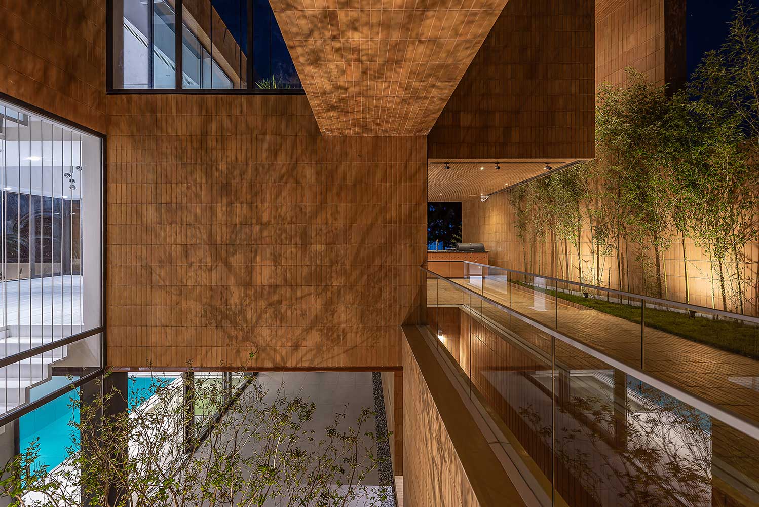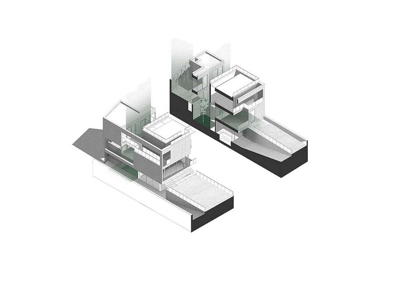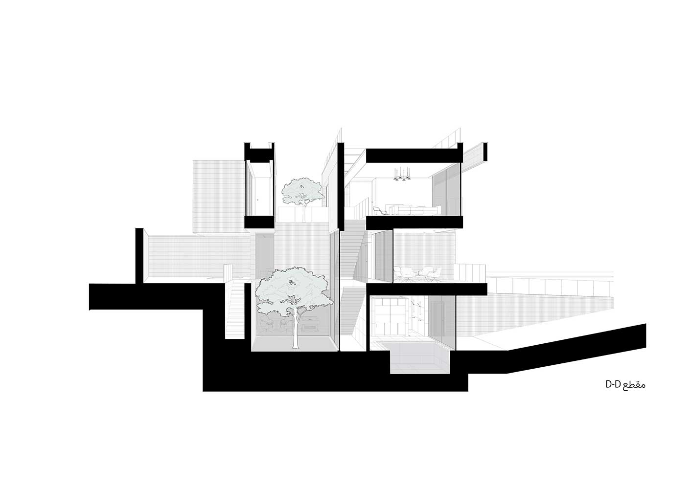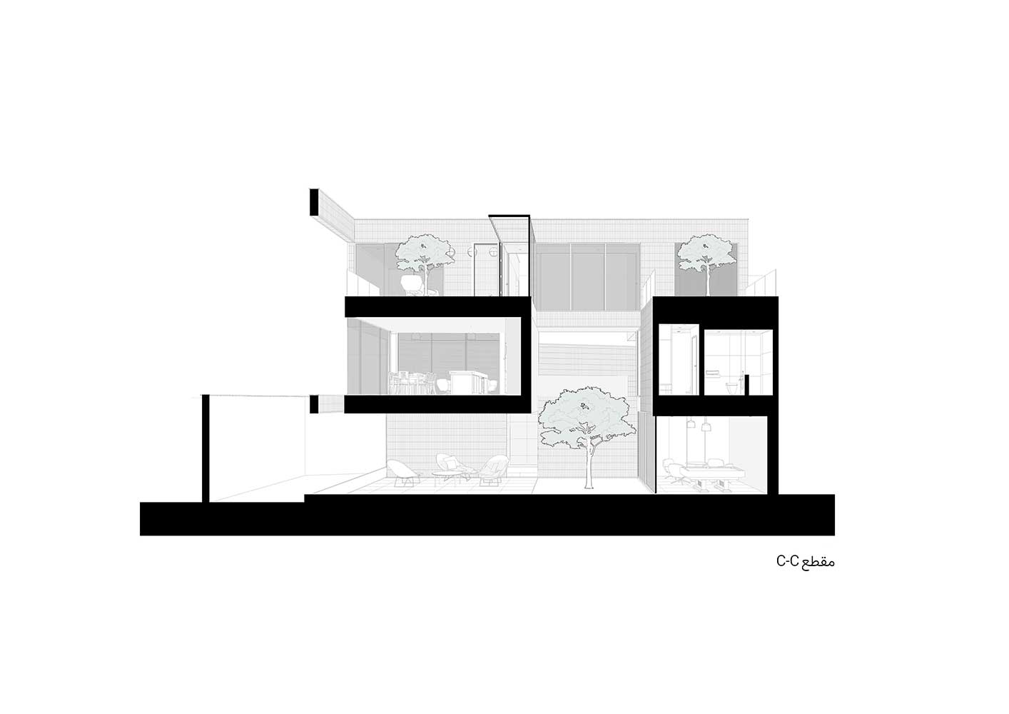 The semi-central courtyard, embedded within the project, interacts with both covered and open voids on all three floors to maintain a degree of continuity. Acting as a sturdy trunk, it unifies the spaces around it and conducts light down to the basement