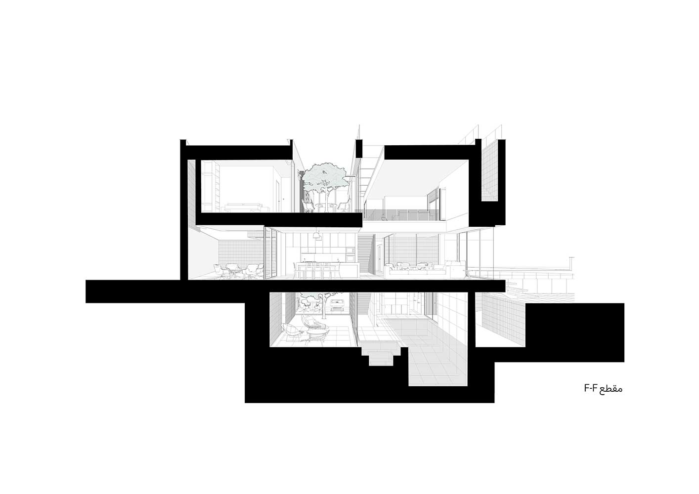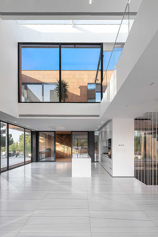 The ‘Voids’ began to grow, driven by a desire to combine void spaces within a relatively ordered and static box. The villa, through its openness on one side (facing desirable views) and its closure on the other (adjacent to neighboring lands), adopted a combined extroverted-introverted typology; an extroverted structure that embraces diverse internal courtyards and intermediate spaces. The maximum northern courtyard, maintaining the greatest distance from the building, presents a relatively transparent and extroverted facade upon entry, while the minimal southern courtyard, with various light shafts, creates small internal spaces