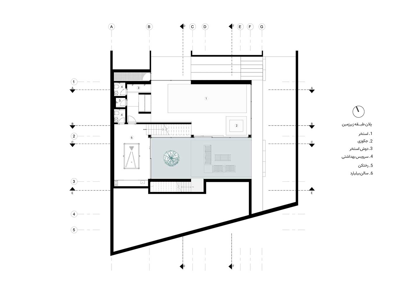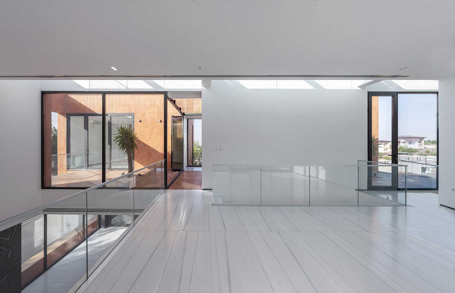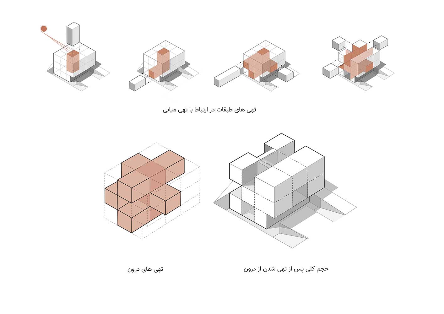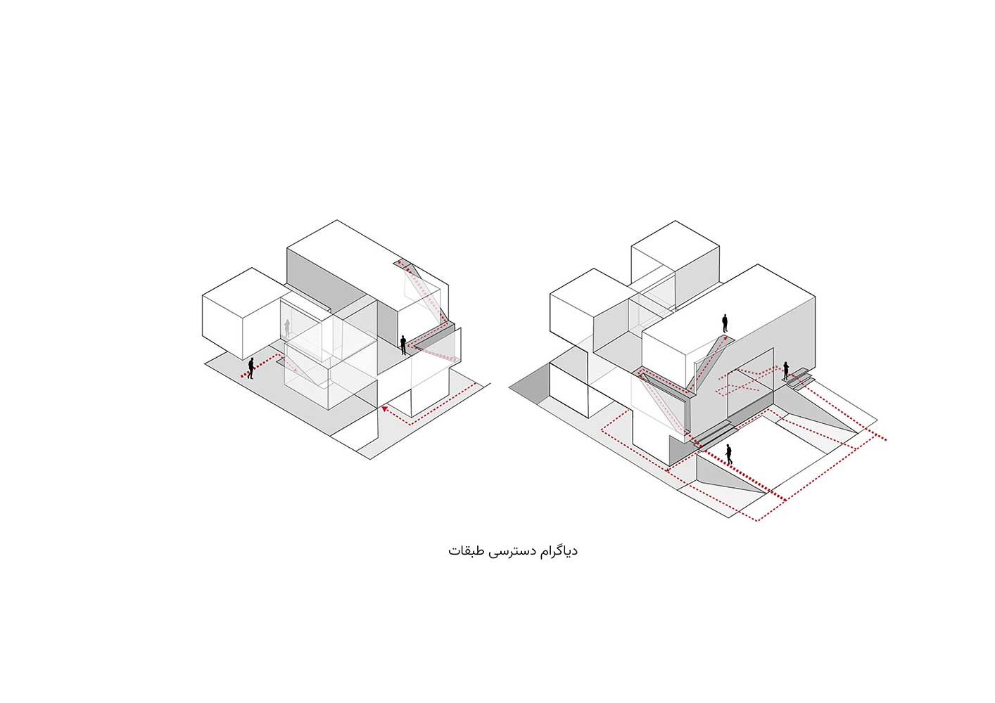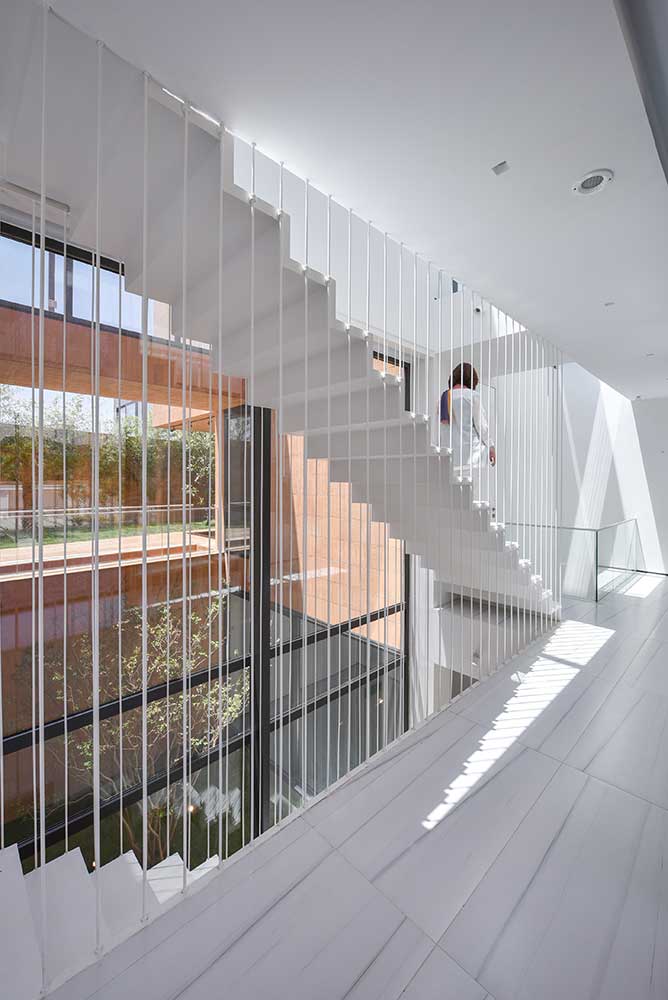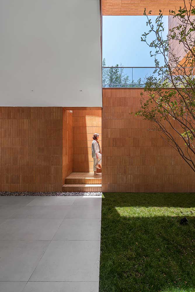 Consequently, the occupied spaces are marked with lighter colors like white, and the voids are emphasized with heavier brick tones, creating a duality of light-filled and weighty spaces. This way, the inclusion of various terraces and courtyards alongside public and private spaces attempts to fulfill the inherent human need to connect with nature, especially considering the more favorable climate outside the bustling city of Tehran