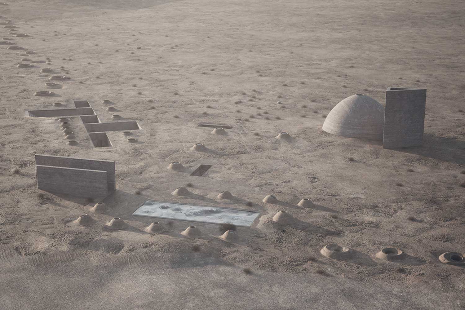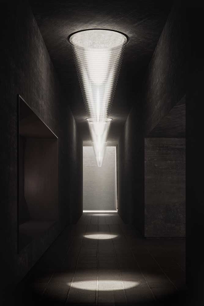 The light and wind catcher provides air circulation for the underground pathway. This pathway connects these triad programs and reinterprets the Qanat system with its domed skylights.