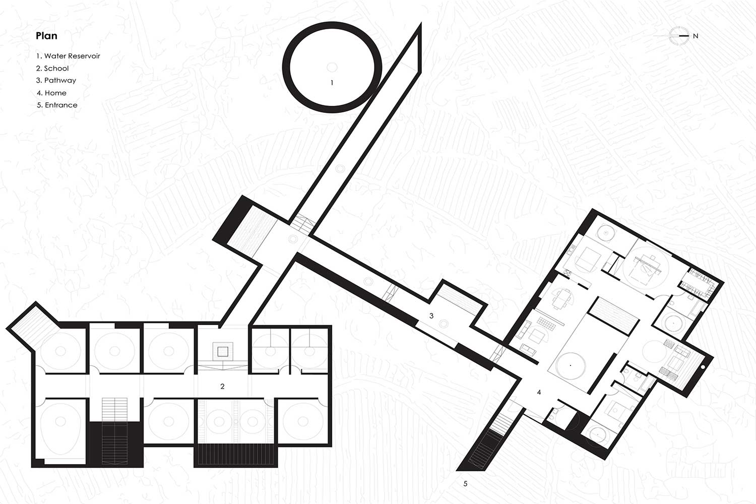 Qanats, landscape, earth, ancient building techniques, and historic references gradually formed our ideas. We did not want to make only a home in the middle of an abandoned place; we wanted to use architecture to solve existing challenges. So, we established two other programs to add something to the community: a school and a water reservoir.