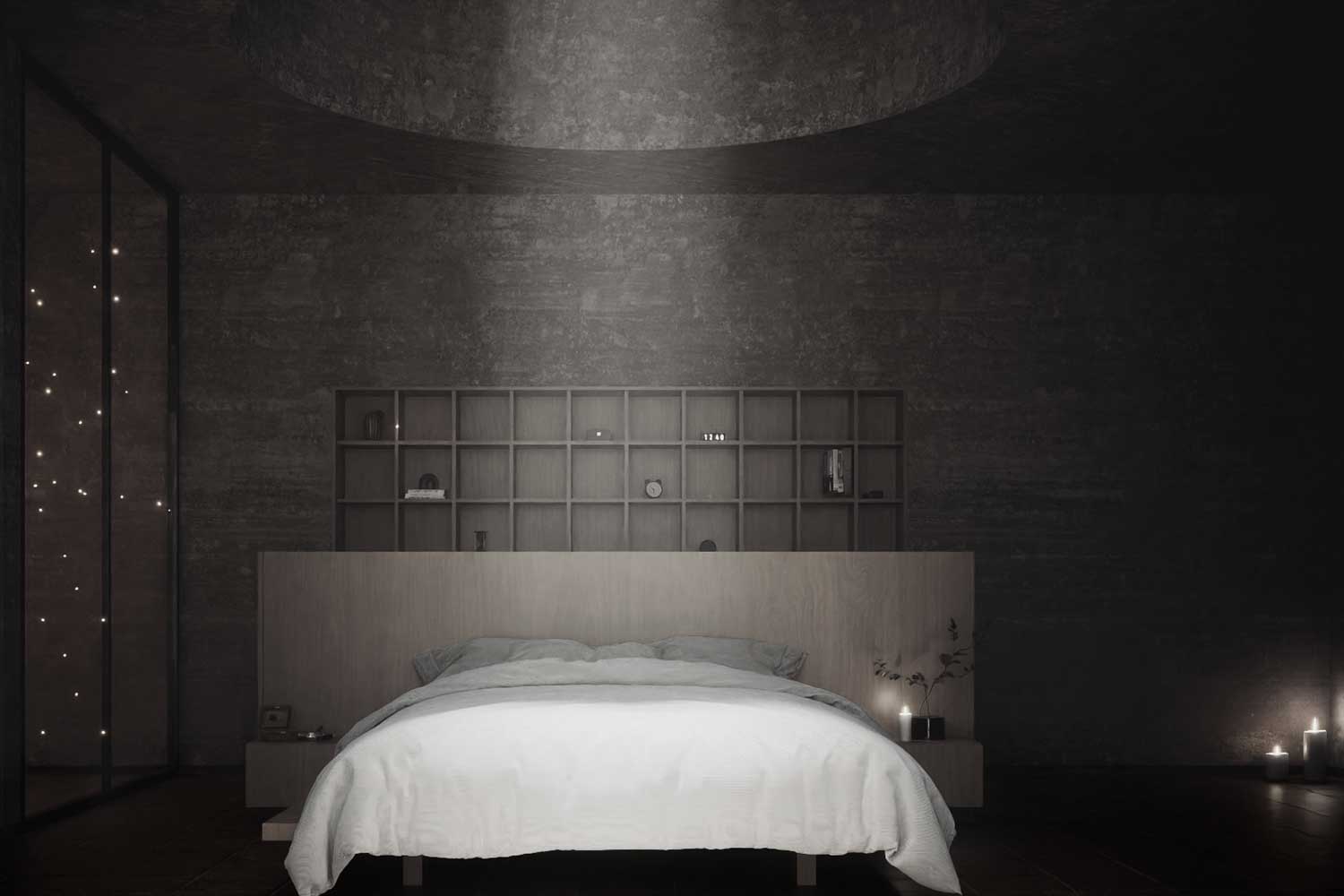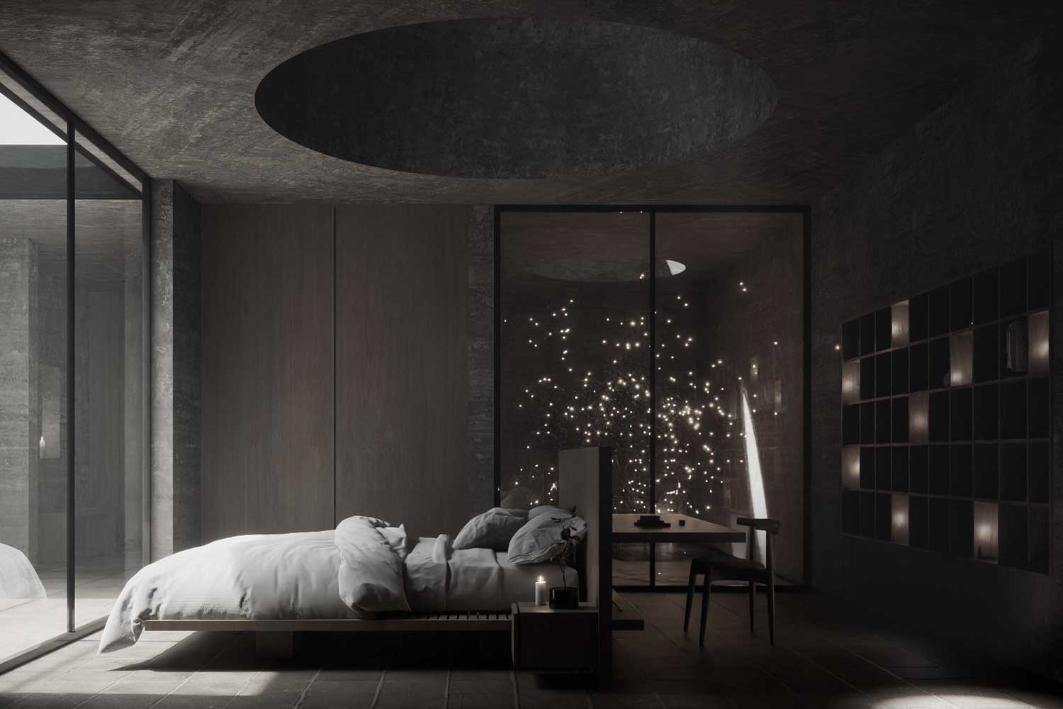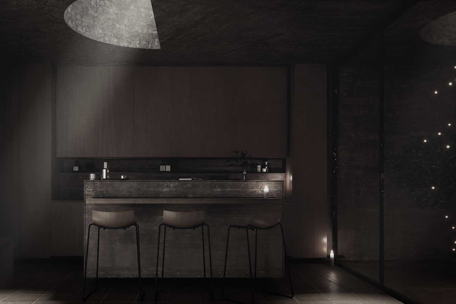 In the home, spaces are illuminated by either direct or indirect light. Natural lights entering from domes or glass pools will function as skylights. The shape and size of domes and their position differ in various ways as they create a different atmosphere beneath at any time of the day. The breezy weather of the desert blows on the surface of the thin layer of water and creates wavy patterns as the natural motion casts an enigmatic shadow and illumination on the yard beneath it.