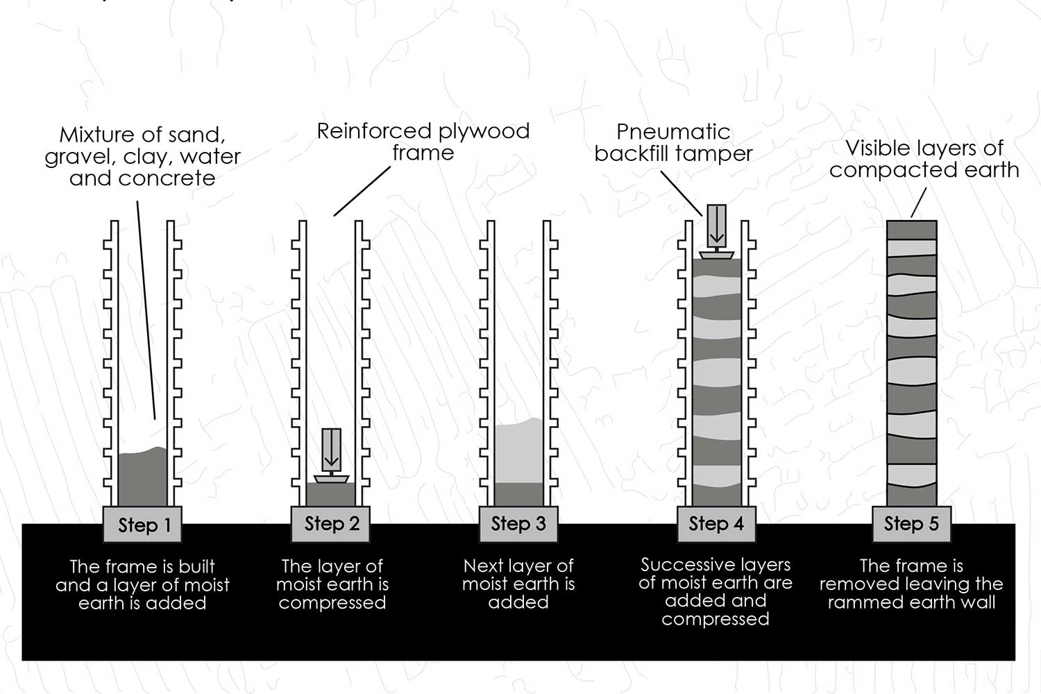 جهت چرخش خانه، منطبق بر جهت قلعه تاریخی ارنان بوده و به مانند بقیه عناصر تشکیل دهنده ترکیب بندی، برای به حداقل رساندن اتلاف انرژی، داخل زمین قرار گرفته است. با استفاده از این تکنیک و بهره گرفتن از مصالح موجود در سایت (خاک کوبیده) علاوه بر اقتصادی بودن، نیاز به استفاده از سرمایش و گرمایش مصنوعی به حداقل میزان خود میرسد. خاک کوبیده ظرفیت گرمایی بالایی دارد ولی در اینجا مصالح نه صرفا به جهت ملزومات تکنیکی، بلکه برای ما تجربه لمس معماری و روایت گری در فضا را فراهم میآورد.