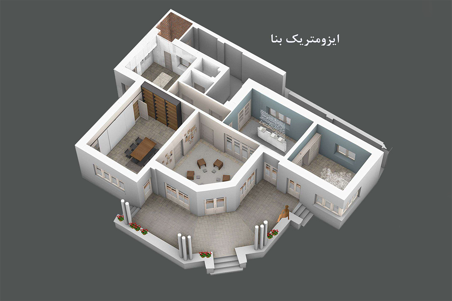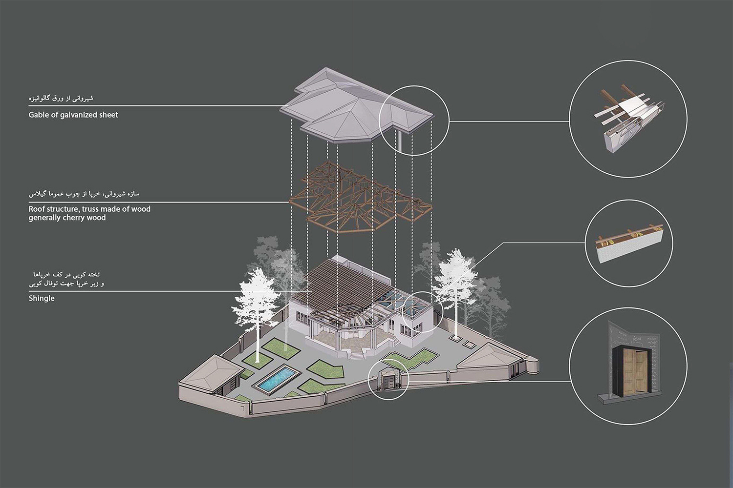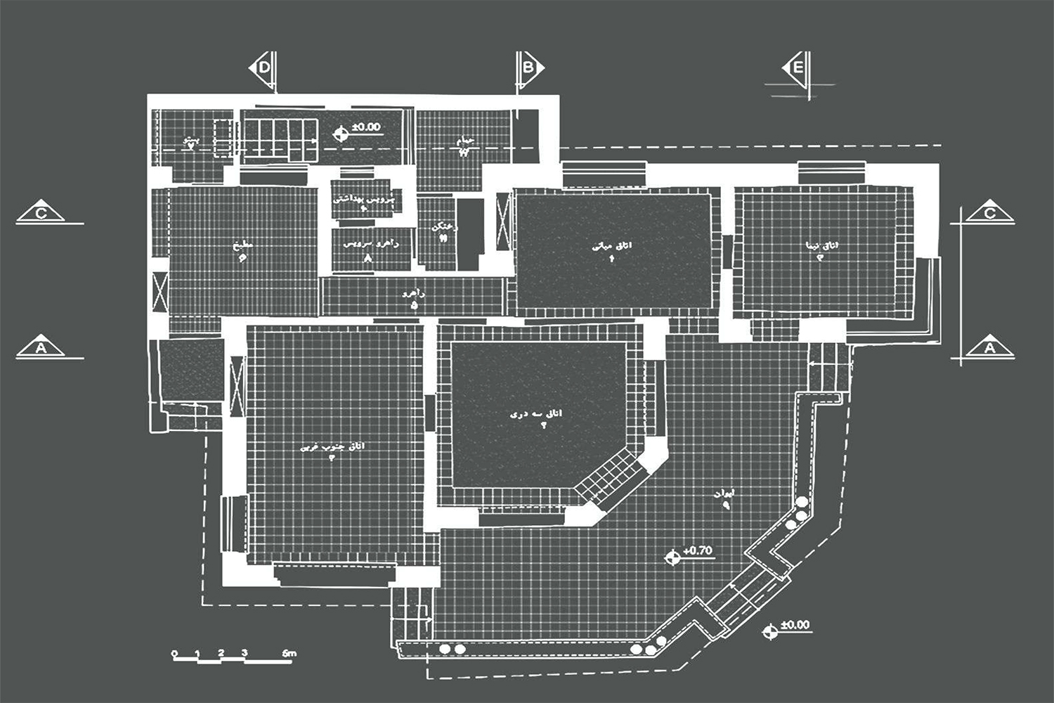 The main framework of the Nima house restoration approach was minimal intervention, reversibility of interventions and their distinction with the original parts of the building. First, the relationship between the house and its setting was noticed over time. Therefore, the main passage that connected Nima to her two lifelong friends, Simin and Jalal, was considered to be paved. In the historical documents, a trace of an entrance door was identified, and based on this document, it was decided to build it. The main question that was raised was how this door should be? Given that a detailed document of its details was not available, the implementation of a structure with architectural details of the Pahlavi period could lead to the deception of the viewer. Therefore, a new door was made with a modern, very light and reversible structure (glass and delicate metal frame). Two additional structures have been added to the building according to the mass and space identified in the aerial photo of 1335. Their height is considered so that not only do not distort the character of the house, but also show the value of the house in front of the high neighbors that violate the visual bufferzone of the building.