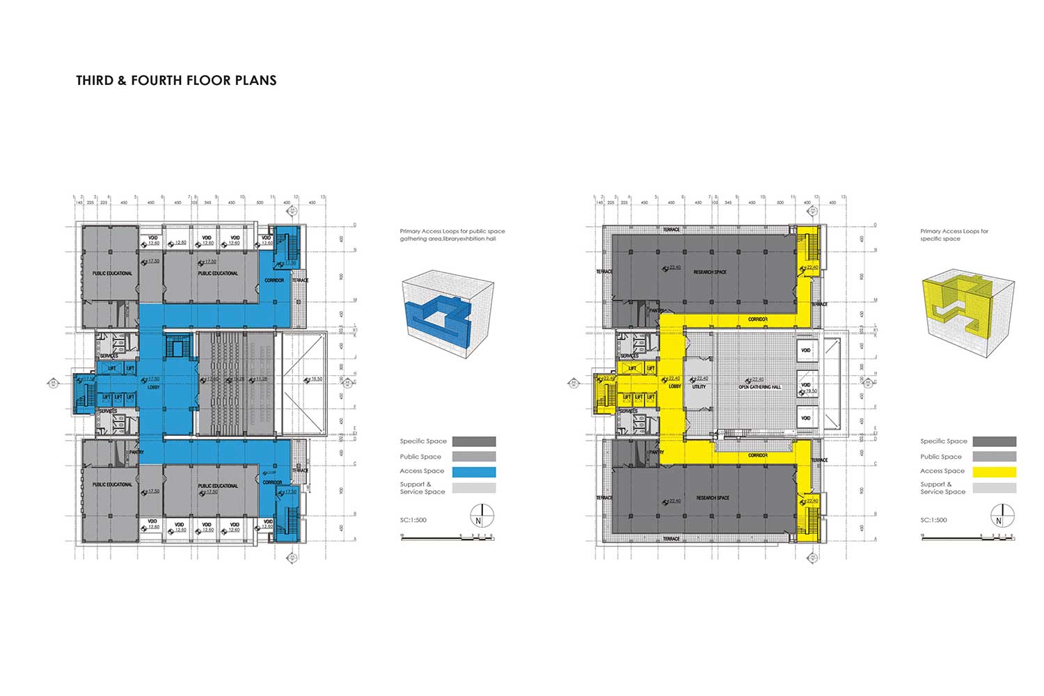 در این ساختار، «حلقههایی» به عنوان فضاهای حرکتی و دسترسی تعریف شدند که تمام بخشهای دیگر پروژه بر محور آنها سامان یافتند. فرم و ساختار این حلقهها تابعی از عملکرد و نقشهی طبقه مربوطه بوده است. پروژه درواقع از دو عنصر اصلی «باکس» و «حلقه» شکل گرفته است. در ابتدا، حلقههایی با ماهیت دسترسی (عمودی و افقی) طراحی شدند تا بتوانند محدودیتهای سازهای را کنترل کنند؛ چرا که نبود یکپارچگی در دسترسیها و گسست فضایی ناشی از سازه، چالشساز شده بود. بهدلیل وجود درز انبساطهای متعدد و بزرگ، این موارد یکی از عوامل اصلی تفکیک باکسها درون پروژه شدند. در بسیاری از قسمتها، از پوشش این باکسها اجتناب شد تا این موضوع برجستهتر دیده شود.
