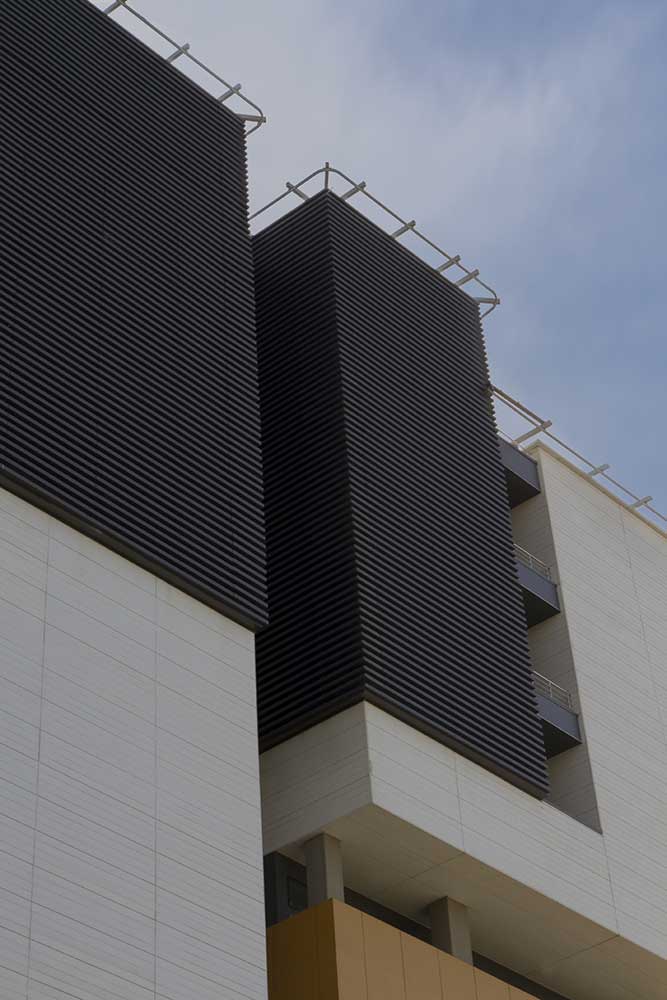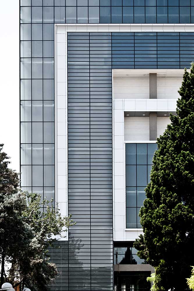 تمام فضاهای باز (تراسها و امتداد راهروها) و توازن پنجرهها با دقت و هدفمندی شکل گرفتند. تراسها به عنوان شکافهایی در بافت پروژه، هم گرههای فضایی هستند و هم عامل پیوند ساختمان با زمینه شهری و طبیعی اطراف. برای ایجاد ارتباط بین کاربران و منظر بیرونی، دو نوار افقی پنجره تعریف شد. در ضلع غربی، پنجرههای باریک لووردار برای کنترل نور و حفظ دید مطلوب در نظر گرفته شد. در ضلع شرقی، تراسی پیوسته با چشماندازی به فضای سبز طراحی شد و طبقات خاصی با تراسهایی طولی به آن متصل شدند.