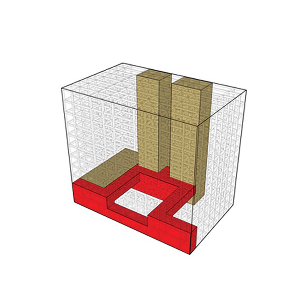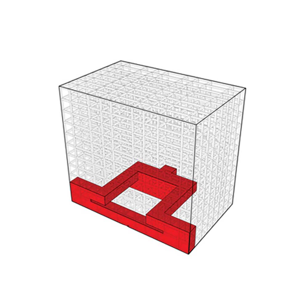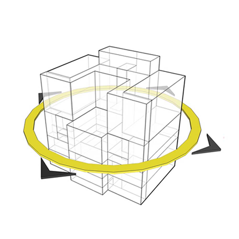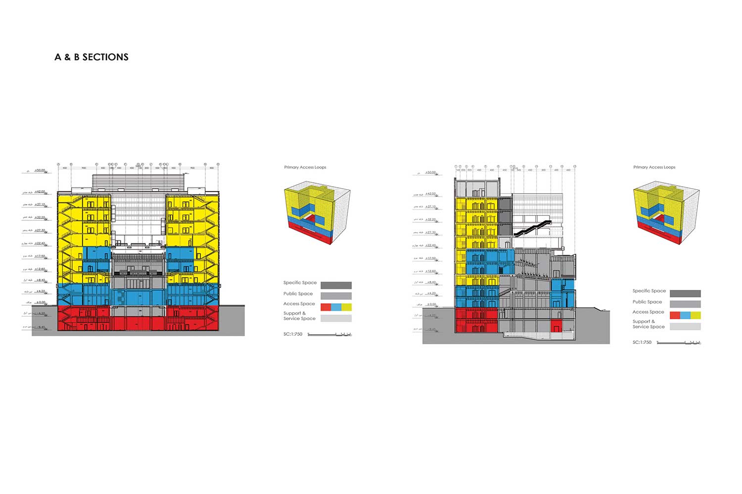 In this structure, some loops have been developed as movement and circulation areas; so all other spaces of the project were organized by them. Form and the structure of loops of each part were defined by the plan and application of that part or floor of the building. In fact, the project was created from two elements of “box” and “loop.” At first, loops with the nature of accessibility and circulation (vertically or horizontally), were placed to control the limitations of the structure, since the restraints of our structure has caused lack of integrity of spaces and lack of proper internal access. Due to the great number and remarkable size of expansion joints, they were one of the main factors of separating boxes within the building. Covering the boxes was avoided inside the building in most of the places to intensify this matter.